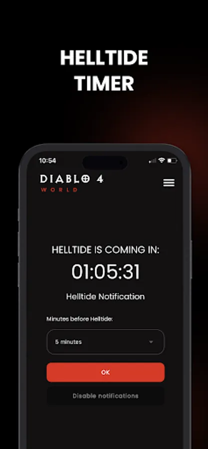 Timer counting time until the beginning or end of Helltide. Set a notification and never miss this event!