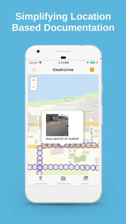 >Photographs: Take geo-tagged photographs with a click of a button from the GeoArchive App