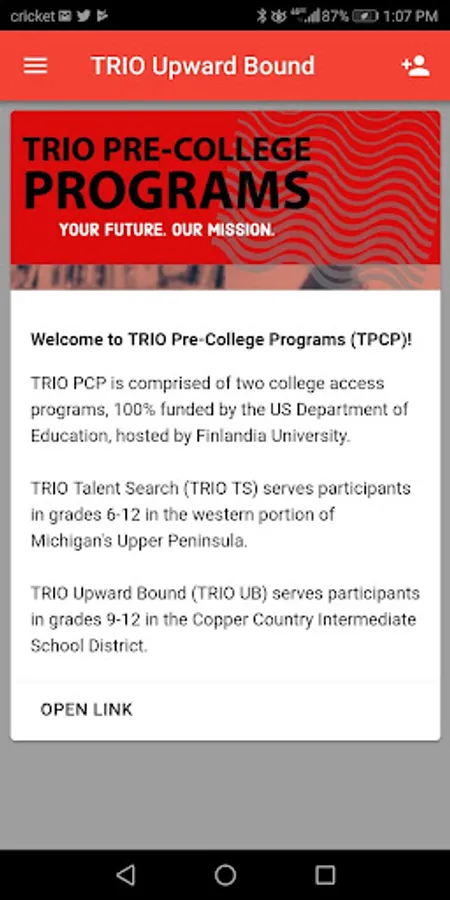 Welcome to TRIO Pre-College Programs (TPCP)! TRIO PCP is comprised of two college access programs, 100% funded by the US Department of Education, hosted by Finlandia University. TRIO Talent Search (TRIO TS) serves participants in grades 6-12 in the western portion of Michigan's Upper Peninsula. TRIO Upward Bound (TRIO UB) serves participants in grades 9-12 in the Copper Country Intermediate School District.