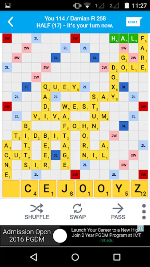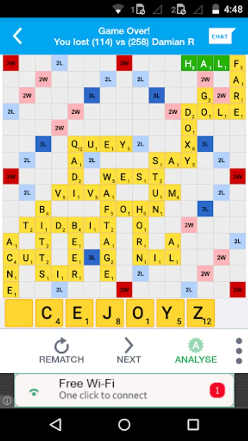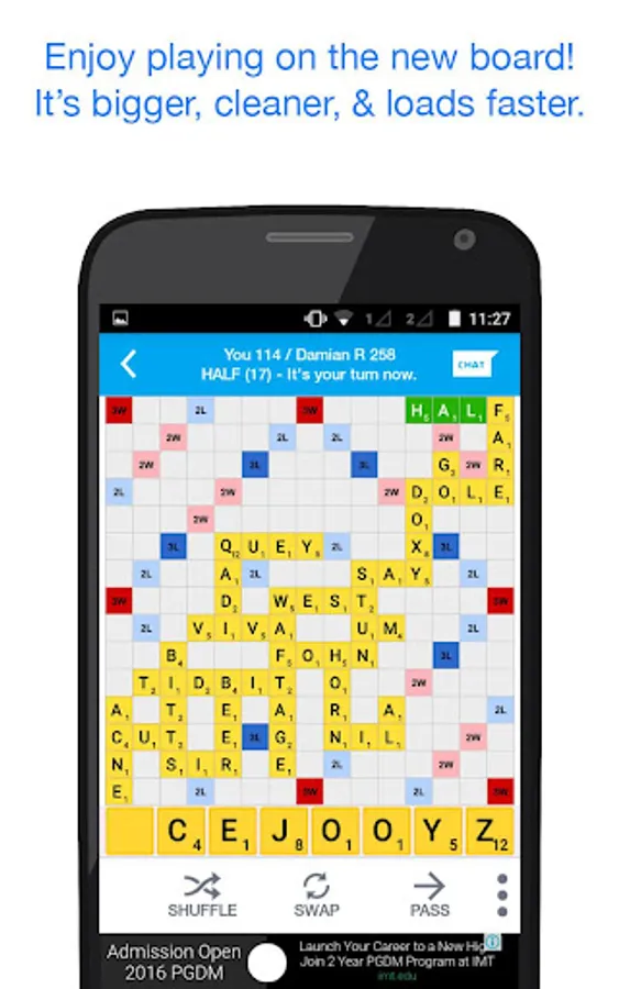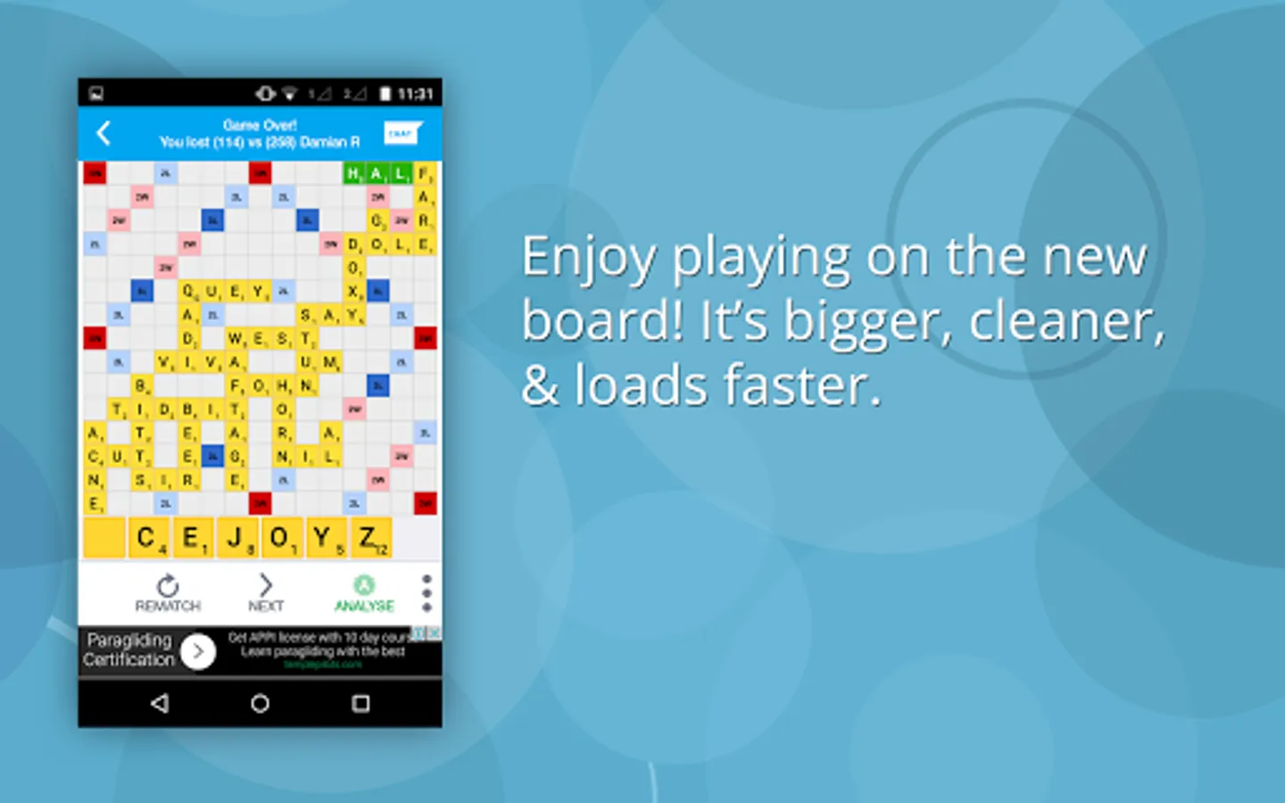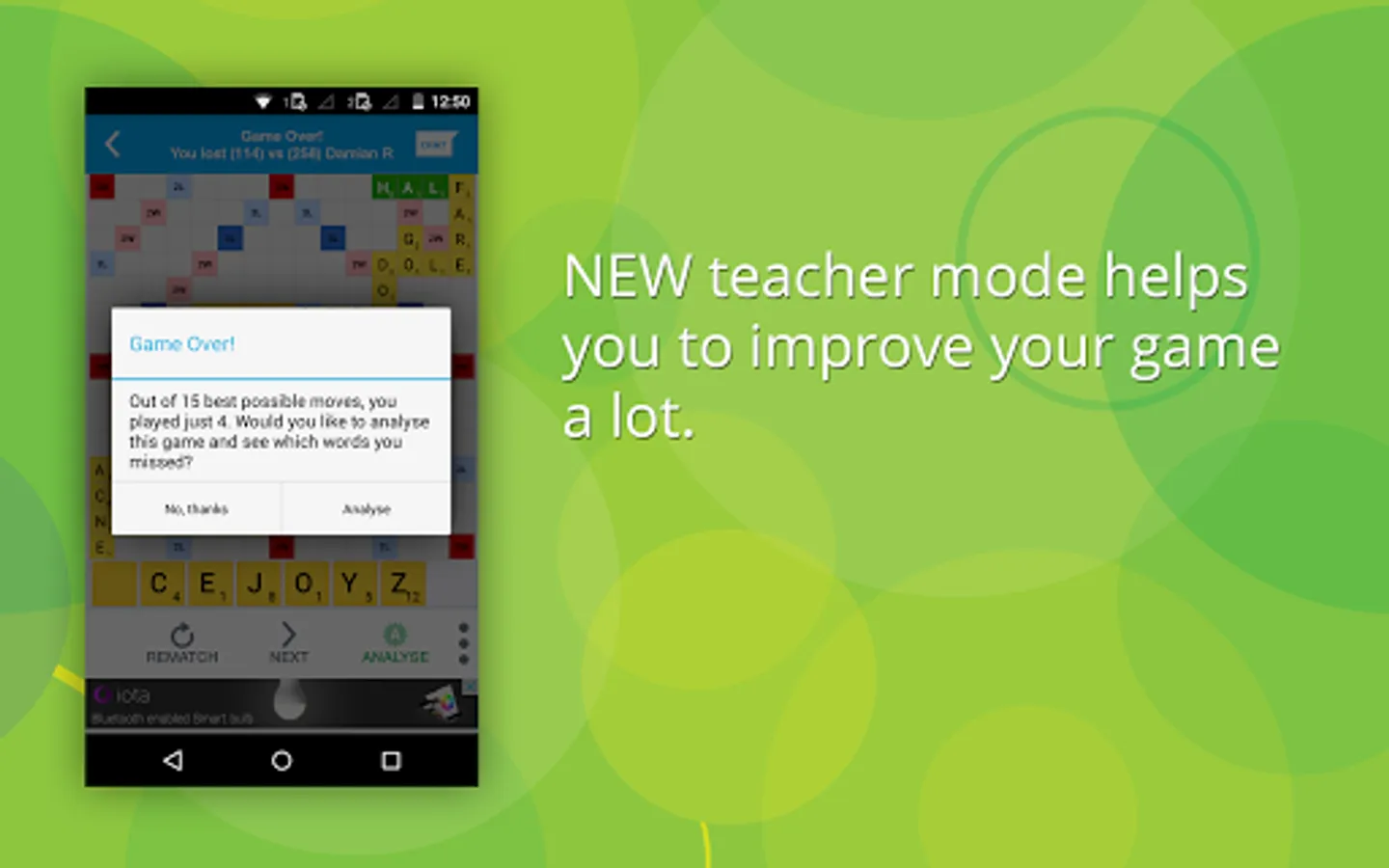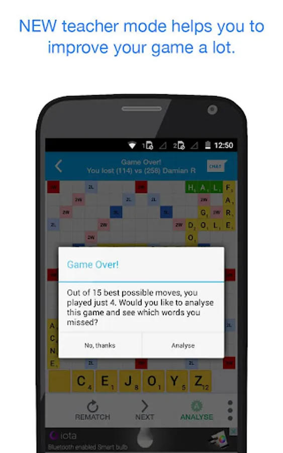 An effective word puzzle where you need to create words on the board whenever it's your turn. Itโs like a new game in each turn but each turn needs to be planned with a long term strategy in mind. Just playing the highest scoring word wonโt always let you win!