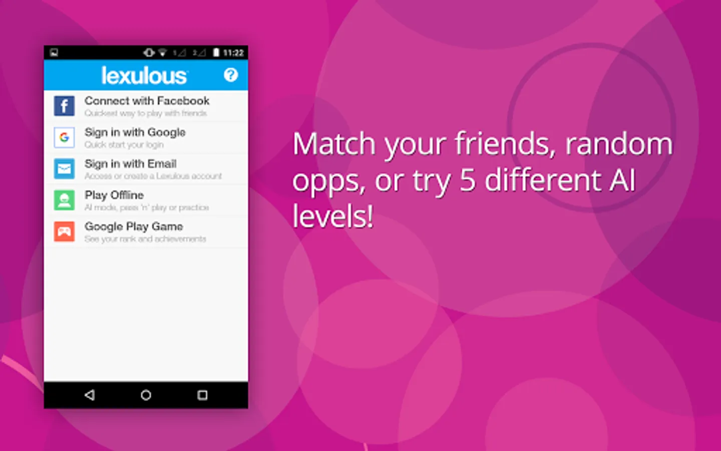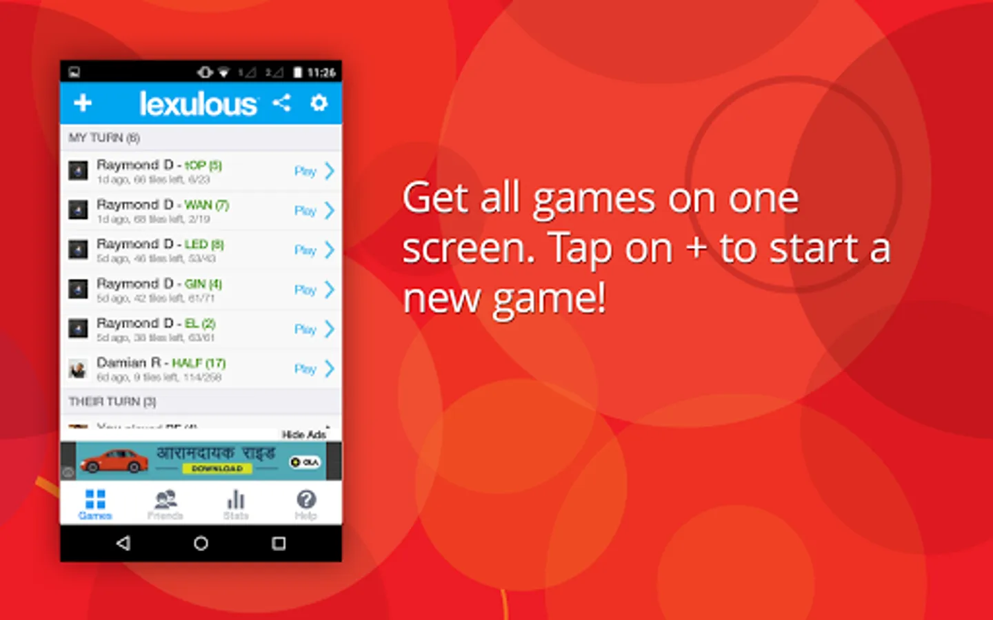 Play with your friends from Facebook, www.lexulous.com or we will find a player for you in the live mode.
