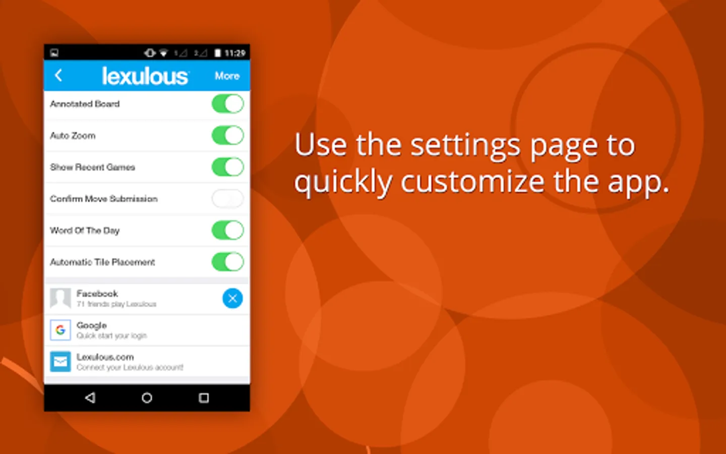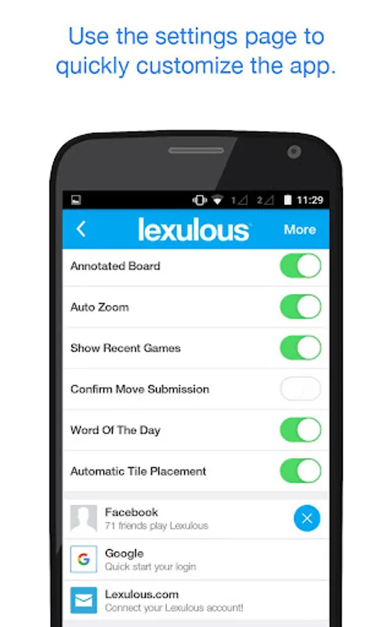 More than 7 million gamers are hooked on and the Lexulous community is increasing by the day. Connect with people across the world and get a chance to challenge and beat ace word players. All you need is a zeal to win and notch up your level gradually. ๐