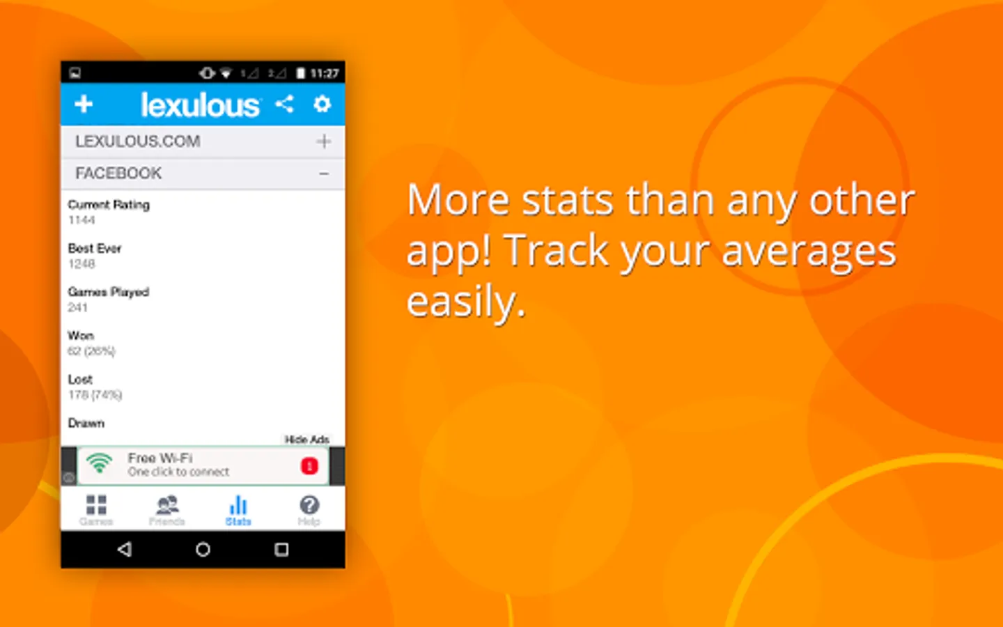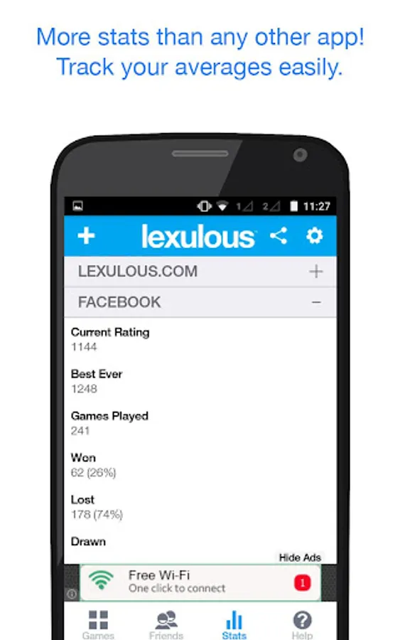 Instant upload of average statistics with the Global Ranking. Get a detailed picture of your stats such as average score, total score number of Bingo words played and many more.