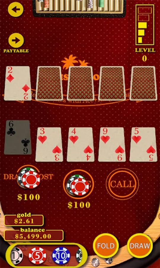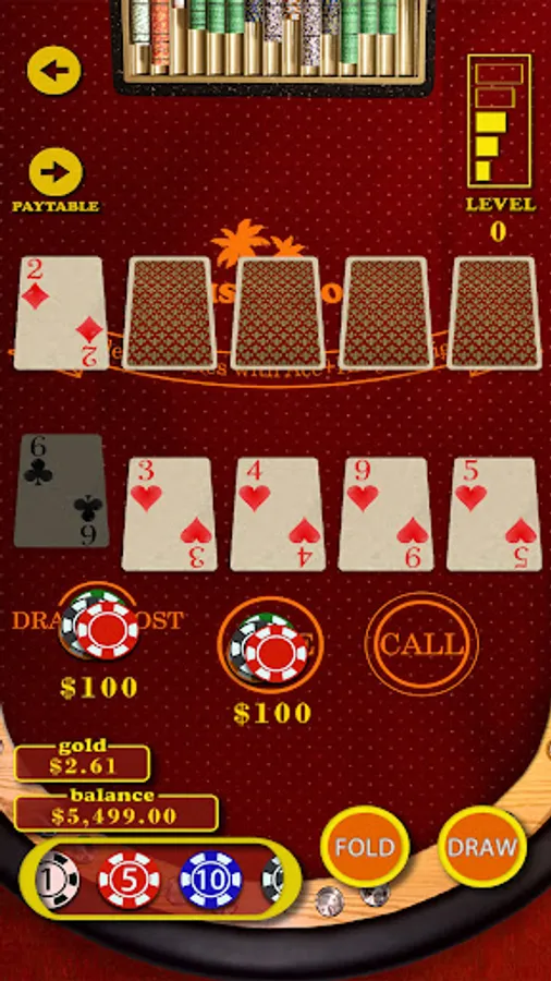 Initially the player places an ‘Ante’ wager and the dealer will deal out 5 cards to the player and themselves. All but one of the dealer’s cards are dealt face down. The player then has to make the decision to either Fold their hand – losing their Ante wager – discard up to 5 cards or ‘Call’. Where the player chooses to discard cards, they will be charged a fee equal to the Ante bet for 1 or 5 cards, 2 Ante bet for 2 or 4 cards or 3 Ante bet for 3 cards they exchange. This fee is not a bet and will not be returned regardless of the outcome of the hand. If the player chooses to Call – either before or after discarding cards - they have to place a bet twice the size of the Ante wager then the dealer’s hole cards are revealed and the hands are compared.
