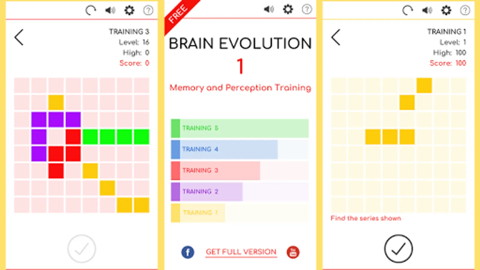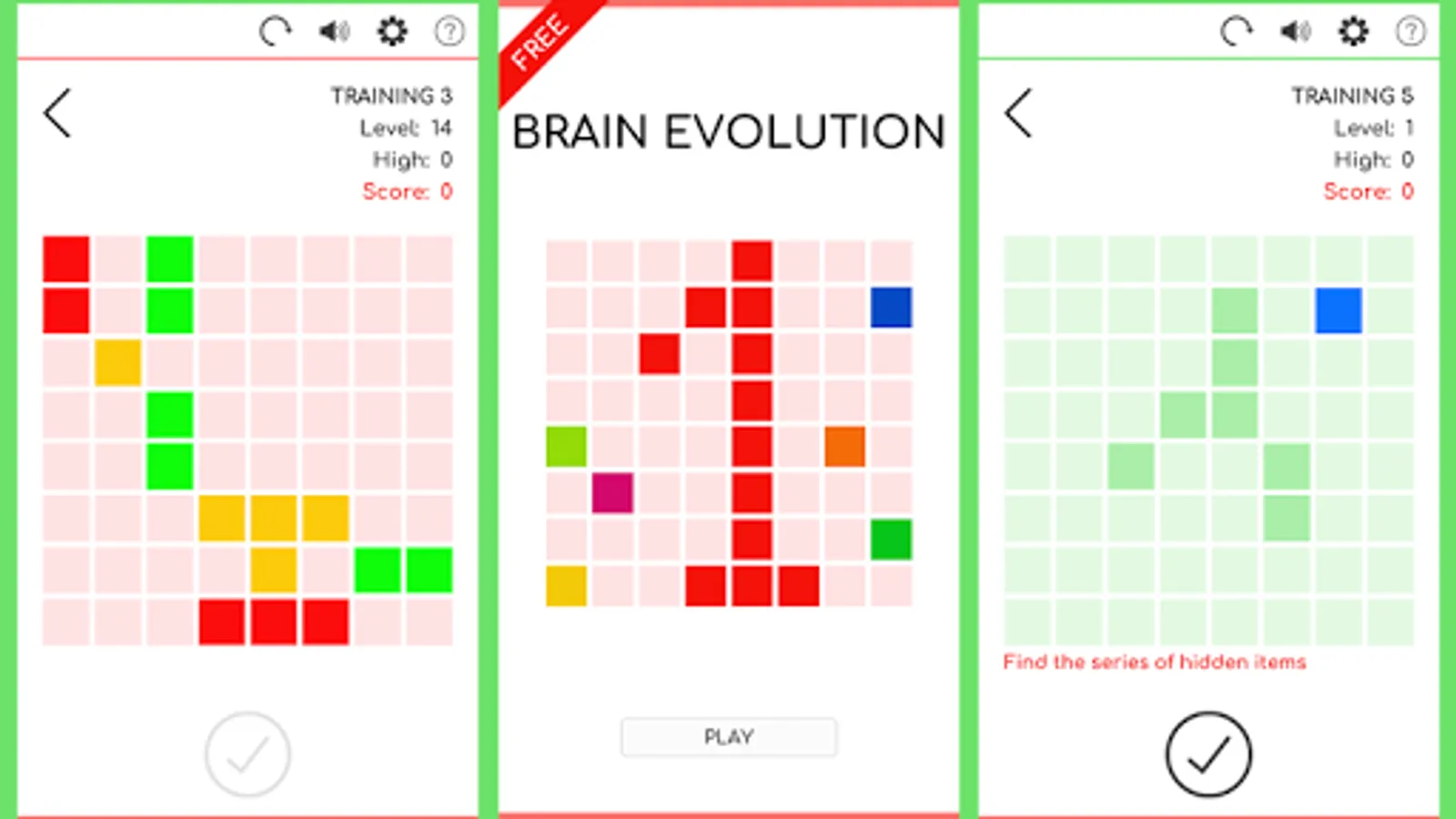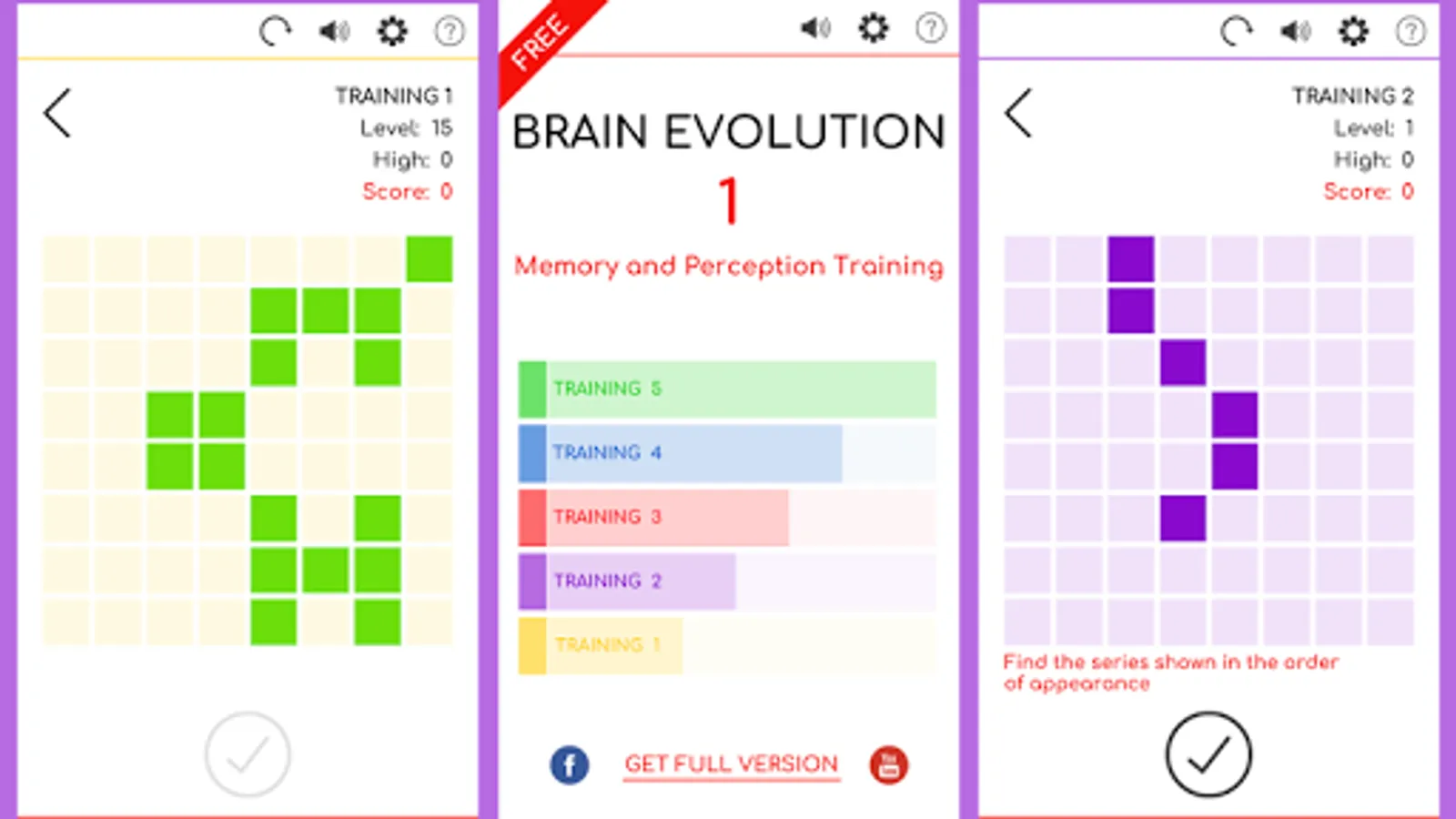 1 FREE BRAIN EVOLUTION is the first application of the Brain Evolution series, it includes 5 workouts With 20 levels each allow progressive training That of perception and memory.
