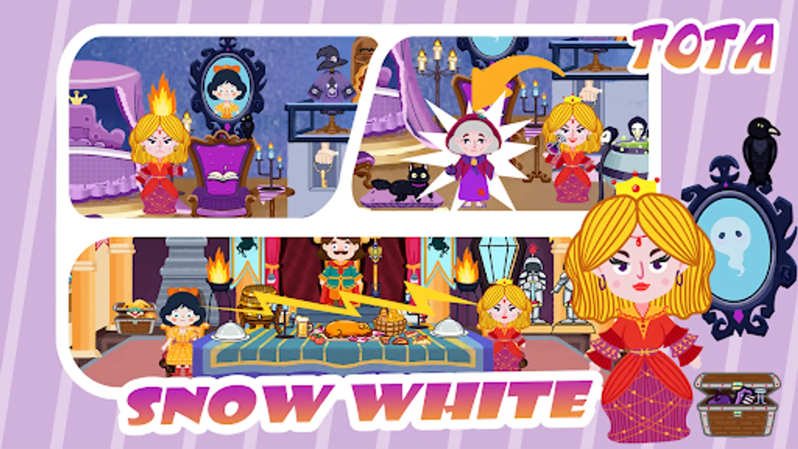 In the Queen's castle, hidden chamber, that is the queen's secret basement; The princess was driven from the palace to the forest, where it was dark. She's gonna live with a hunter house or she's gonna hide with dwarfs house? The small things in the dwarfs' house look really cute. Which bed will Snow White choose to sleep in? Everything seems so beautiful, but the story will not go well......Whether the queen became a witch, or the witch became a queen.