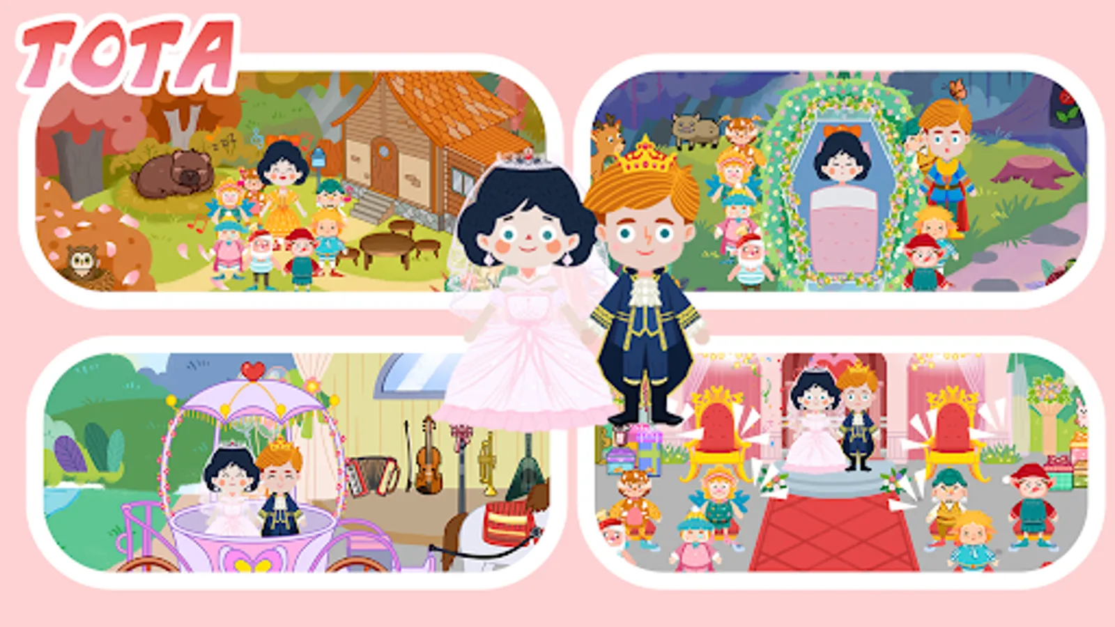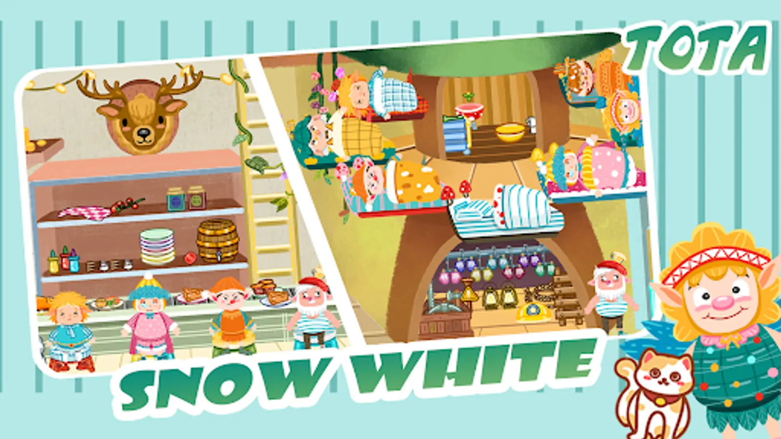 In your favorite fairy tales, there is a classical story named Snow White and the Seven Dwarfs. Each of us is growing up with this fairy tale story. All people like it enough so that it turned into a classic movie. I once had a dream, in which the witch became a good person. Maybe Prince Charming and Snow White finally missed each other? Or the dwarfs liked Snow White very much, so Snow White stayed and stayed with them for the rest of her life. I have lots of ideas, you must have! Today our dream will come true, you will be the director of Snow White and the Seven Dwarfs story, creating your own fairy tale in this game.