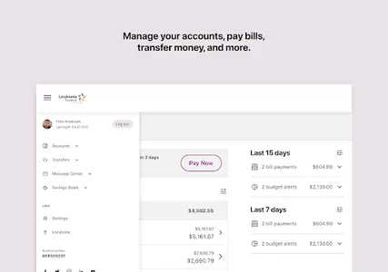 - Pay bills, view recent and scheduled payments.