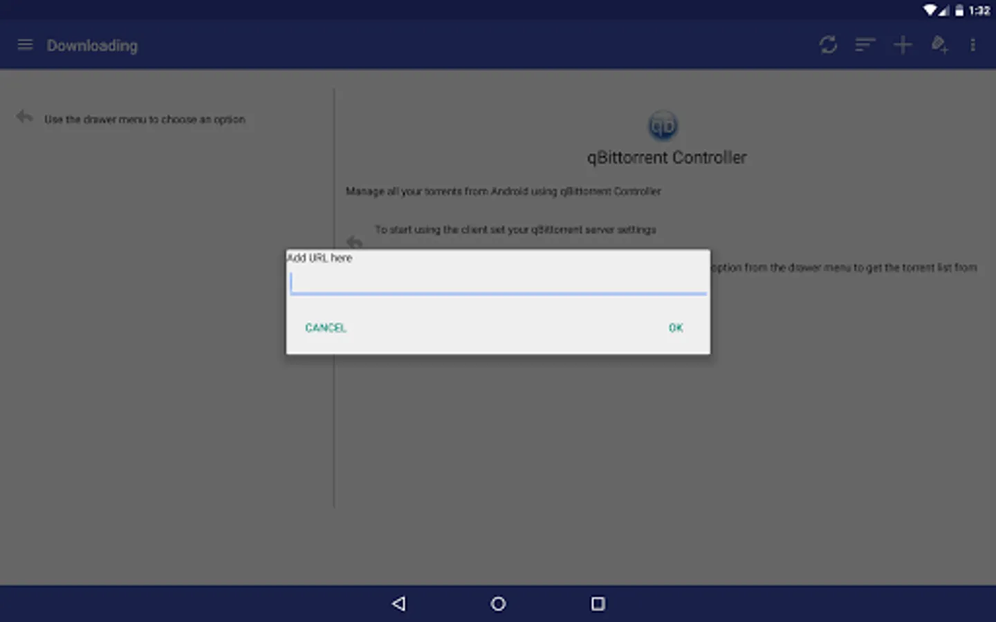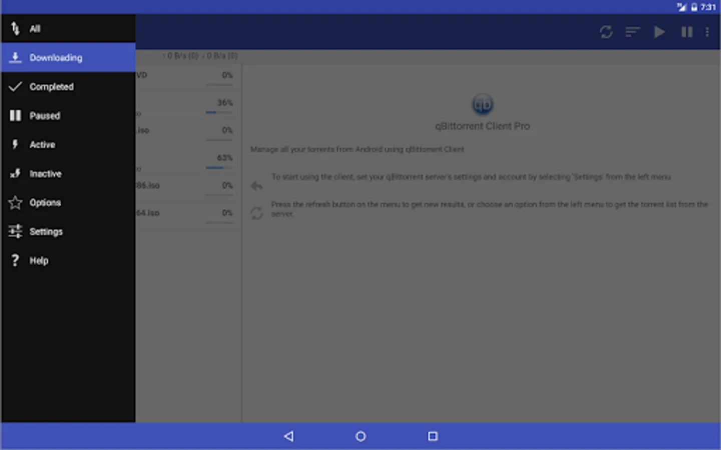 - To start using the app, you must set your qBittorrent server's settings and account by selecting 'Settings' from the left menu.