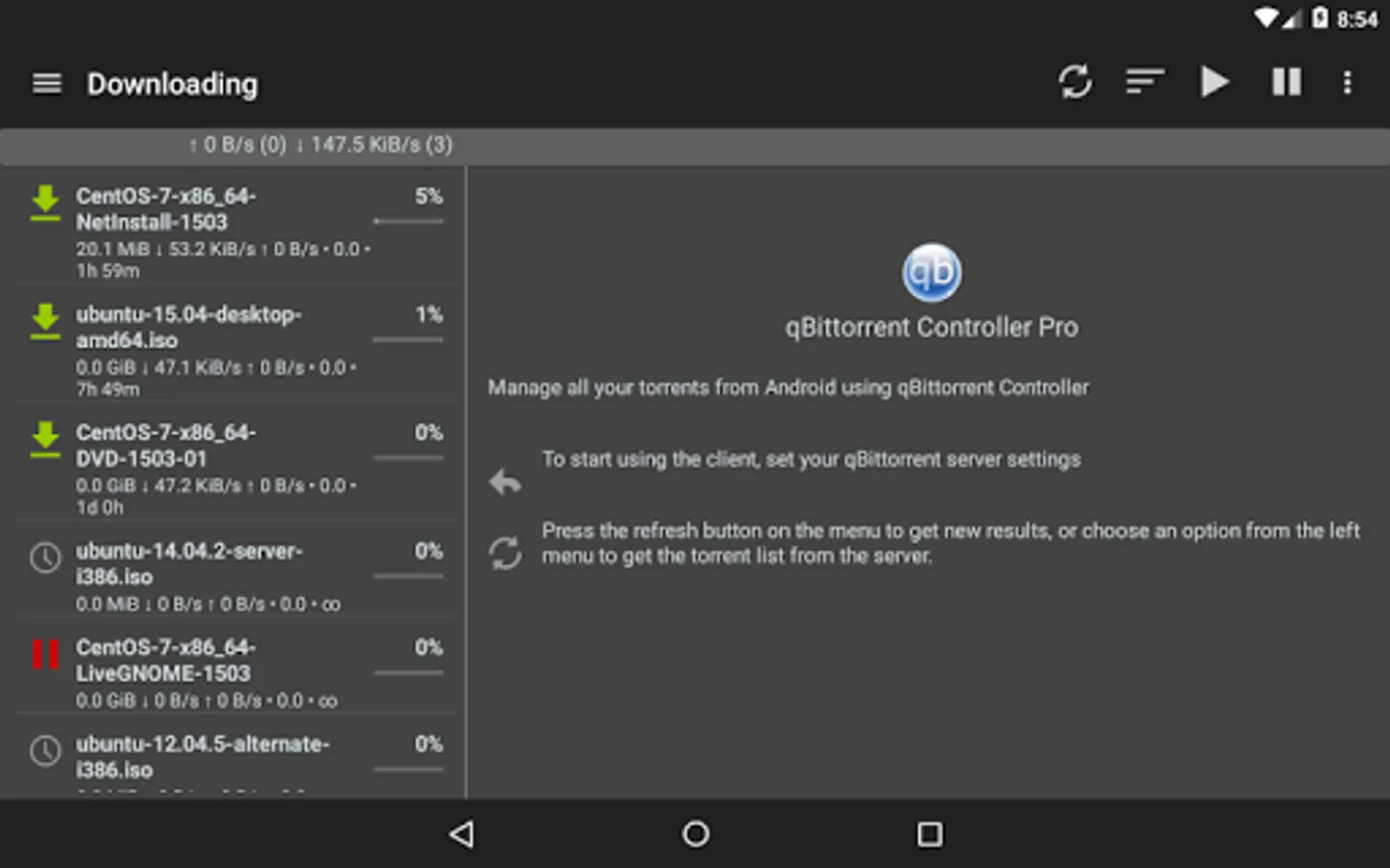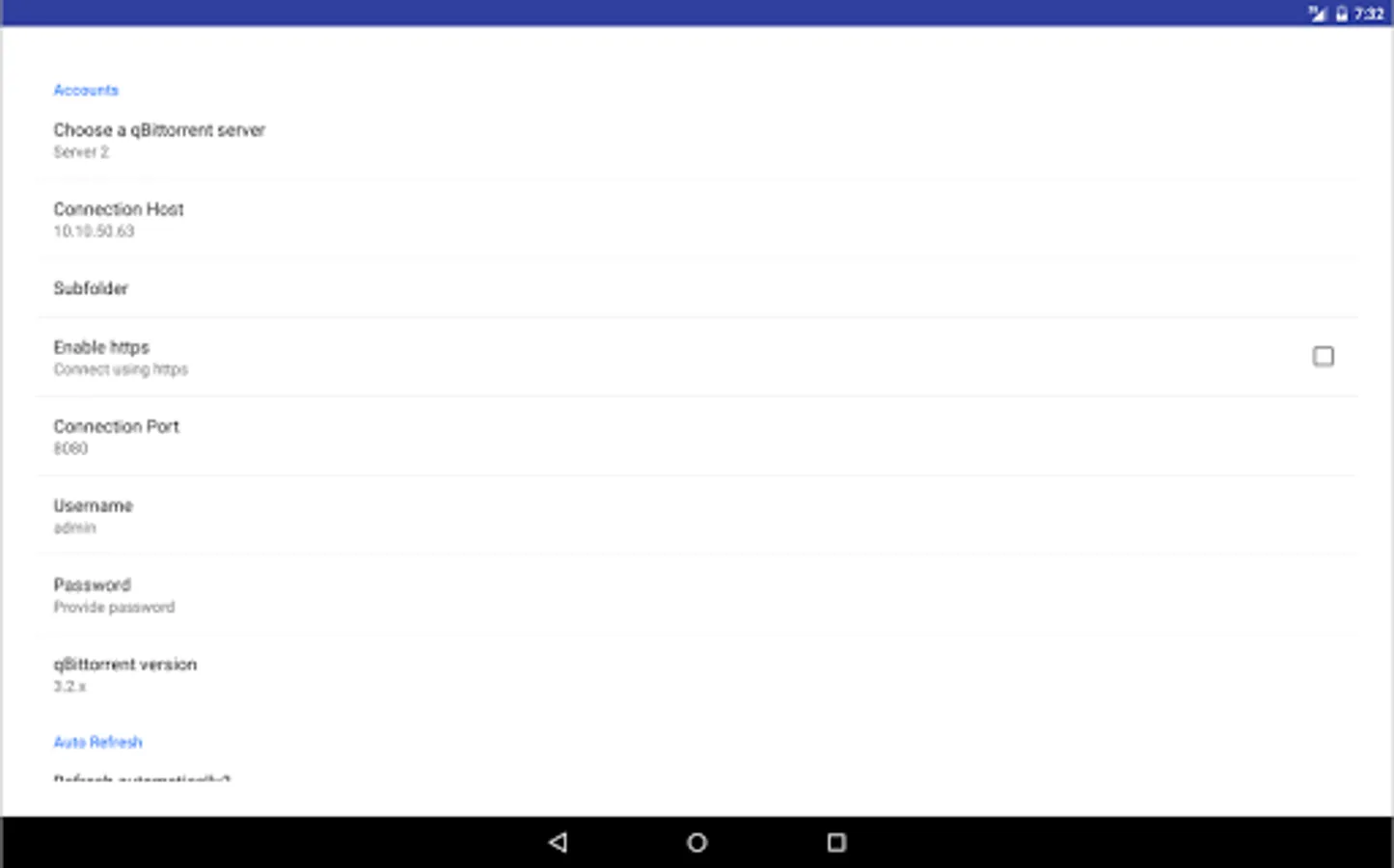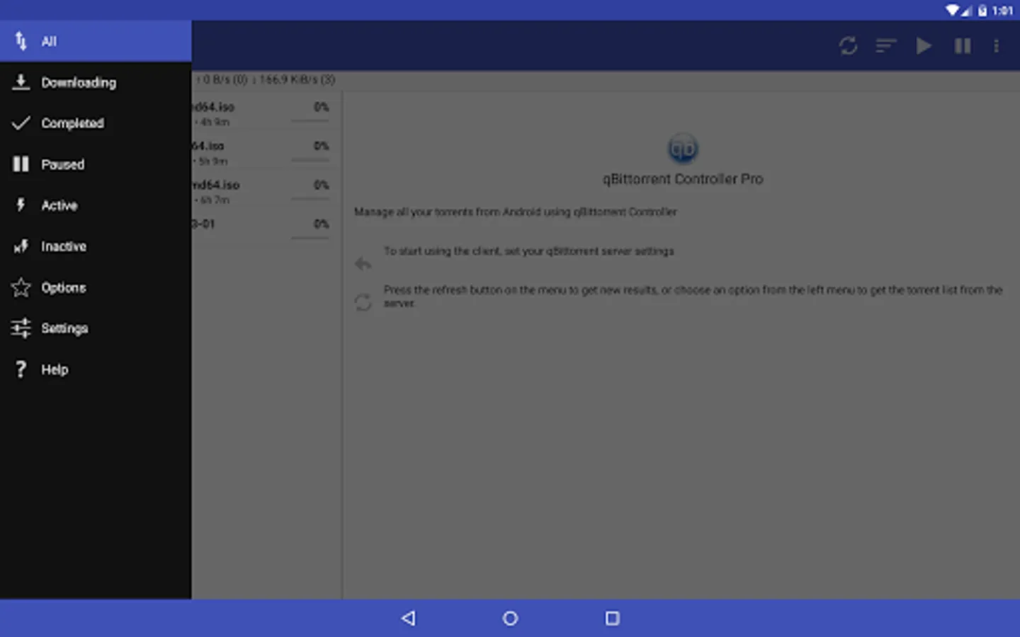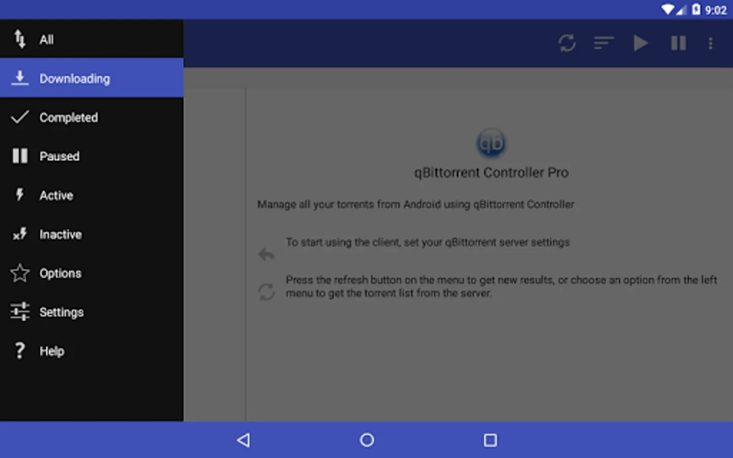 - To start using the app, you must set your qBittorrent server's settings and account by selecting 'Settings' from the left menu.