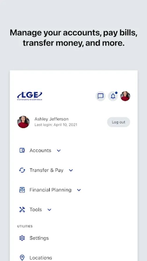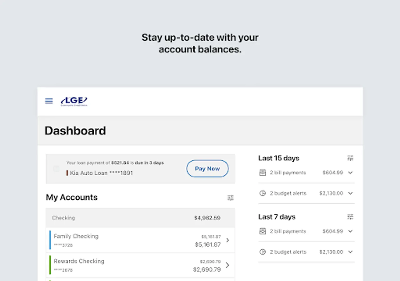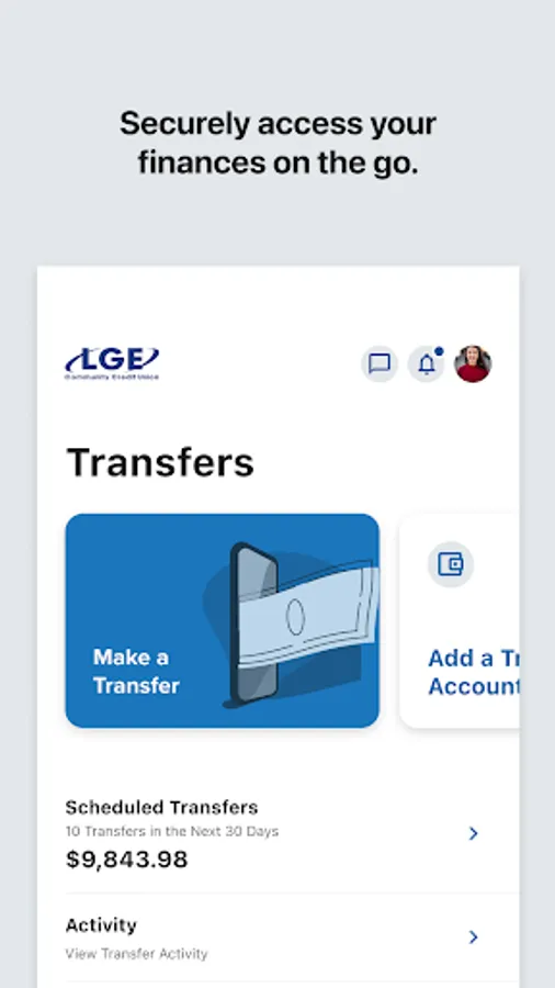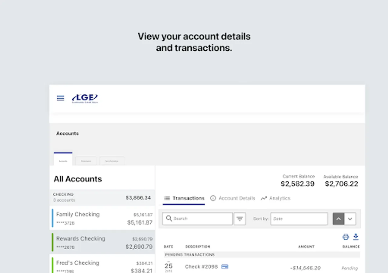 LGE Mobile Banking allows you to make check deposits, view transaction history, check balances, transfer funds, and pay loans on the go.