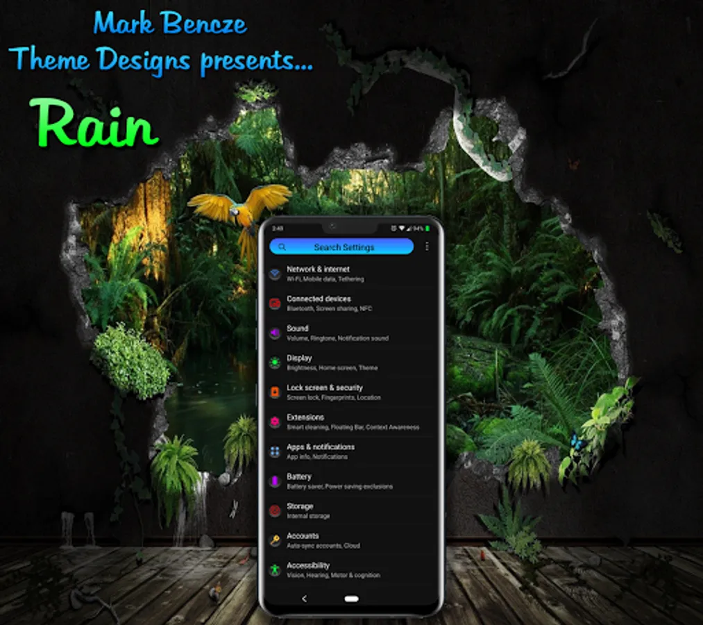 To apply the theme simply go into settings/display and select themes. From there select Rain, and push apply! then reboot and then reapply the theme again. It's a bit more in depth than other themes but given the complexity of this premium theme it is required for all elements to be themed properly. Please note that the G6, V20 V30 are a bit different so you may see slightly different elements on each device that may differ a bit from the screenshot previews.
