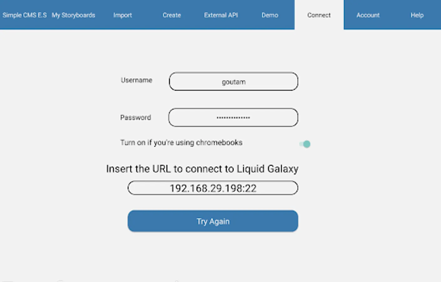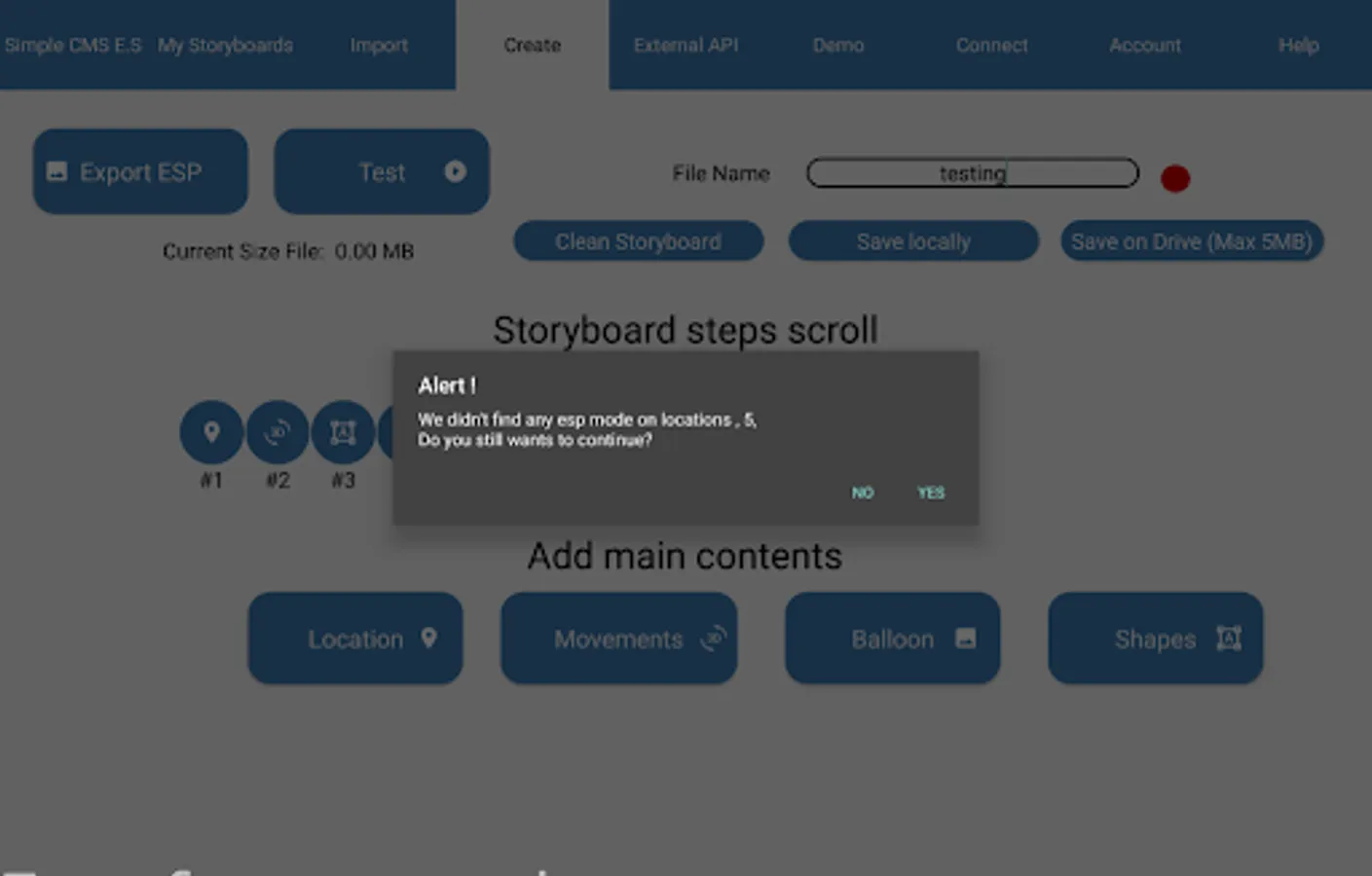 SimpleCMS E.S is an android application. which creates animations and exports storyboard location files in esp format. This application also records the current scenario of LiquidGalaxy and updates it on the user interface.