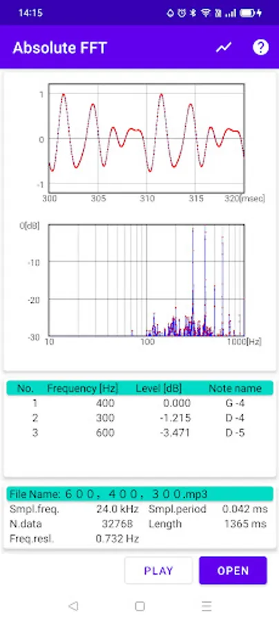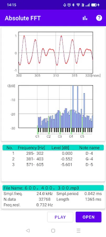 - Actual frequency analysis with FFT; Fast discrete Fourier Transform algorithm.