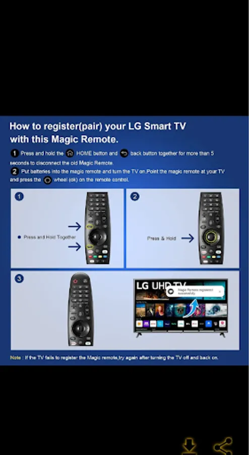 • 🖥【Easy To Pair】Notice: lg magic remote guide If you don't pair this lg tv remote,you can use most of this MR20GA remote control's button functions,but you don't use pointer function and voice function. lg magic remote guide Pair Steps: Turn on the TV and insert 2*AA 1.5V batteries for the remote . After about 20.lg magic remote guide seconds, point the remote toward the TV, then press the Wheel (OK). The remote control will be registered automatically, and the pairing completion. lg magic remote guide message is displayed on the TV screen. (Note: batteries are not included)