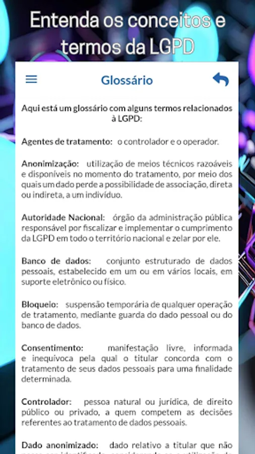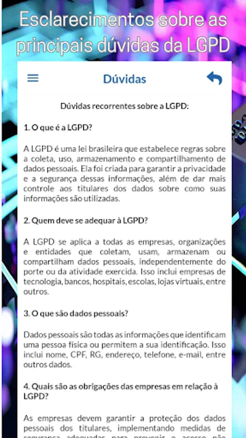 The application features an intuitive and easy-to-use interface, which allows users to access the information necessary to comply with the LGPD in a simple and efficient way. It offers answers to frequently asked questions, practical examples of how to apply the LGPD rules in different situations and guidance on the rights of data subjects.