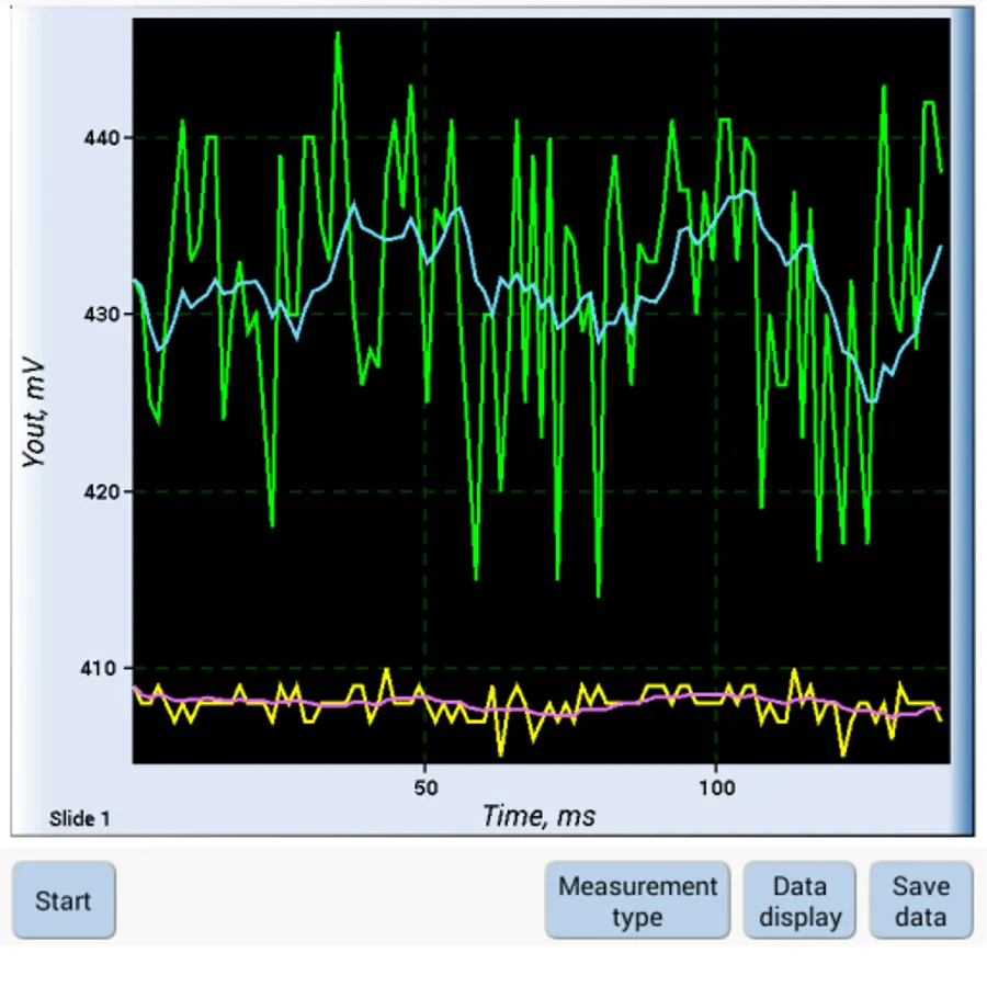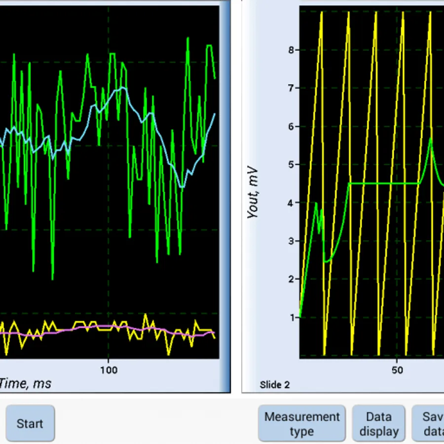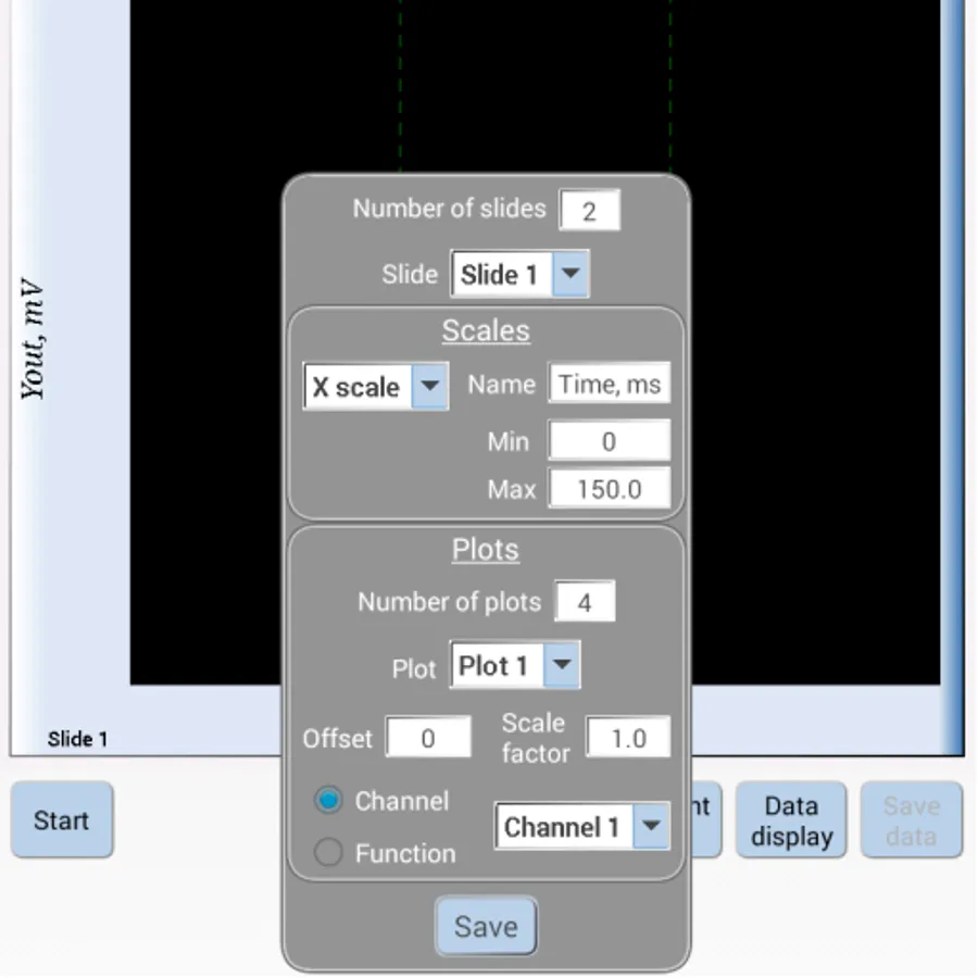 1. Multiple slides (oscilloscope-type windows) for data plotting.