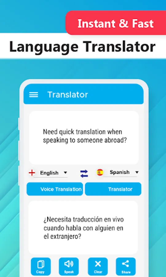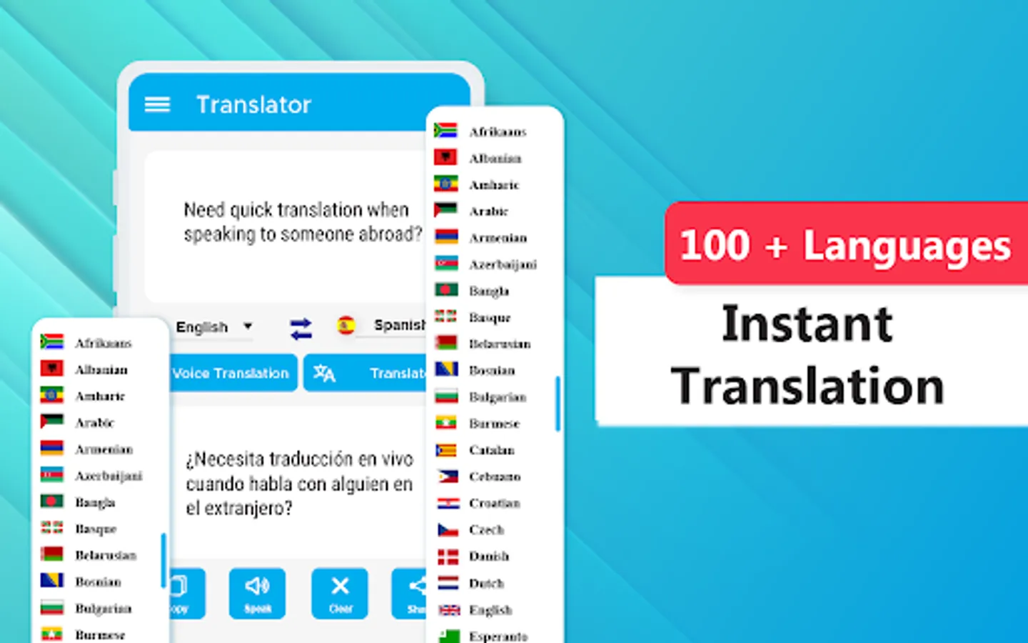 Globalized multilingual Translator all language converter - Voice text translator app searches the phrase and instantly converts the phrase into the desired language, thanks to its language storage capability. In the past few decades, text to voice translator scanner has become a reliable and friendly companion for all tourists facing communication difficulty. The app is easy to use for translating text and voice, since it uses the API of translate.