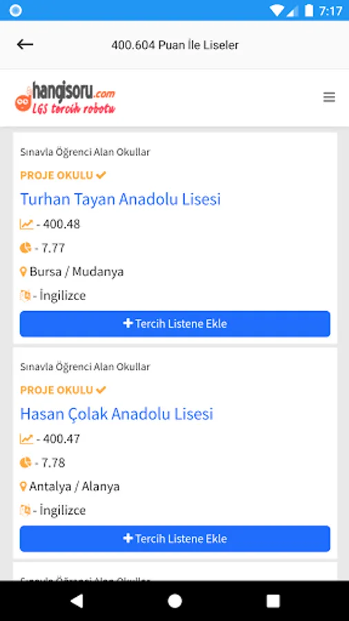 Turkey's most comprehensive High School preference robot is at your fingertips. You can examine the high schools in Turkey that accept students with or without an exam, you can see their base scores and percentiles.