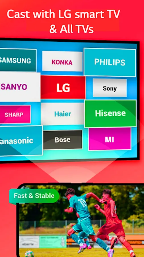 Enable the wireless display option on your phone. Select your TV by clicking on the select button. Enjoy the big screen experience! Not only do we support LG Smart TV and LG TV Plus, but we also support Vizio Smart TV, Roku Sticks and TV, Mirror Link, Hisense TV, TCL Smart television, and Samsung Smart TV.