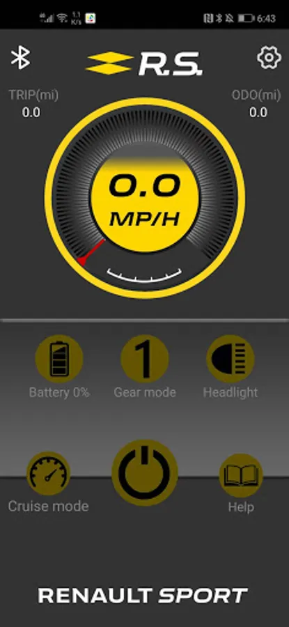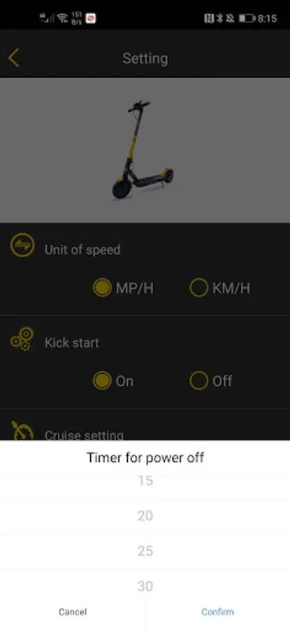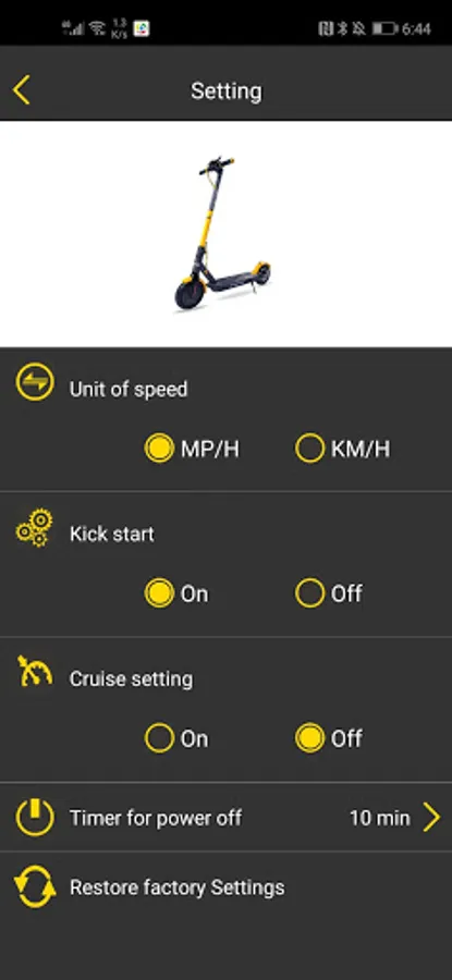 The APP reads the scooter's mileage, current power, speed, controls the scooter's power on and off, headlights, gears, and on the settings page features: Mileage Unit Switch, Non Zero Start Switch, cruise function switch, timer off time settings.
