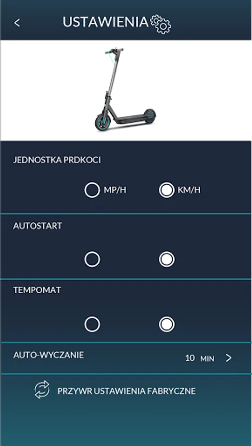 The APP reads the scooter's mileage, current power, speed, controls the scooter's power on and off, headlights, gears, and on the settings page features: Mileage Unit Switch, Non Zero Start Switch, cruise function switch, timer off time settings.