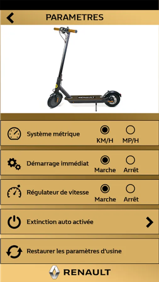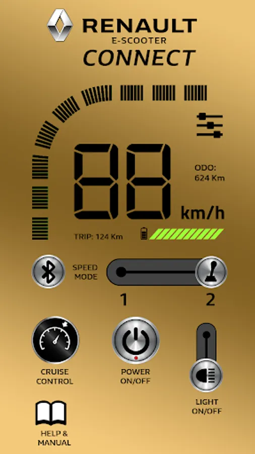 The APP reads the scooter's mileage, current power, speed, controls the scooter's power on and off, headlights, gears, and on the settings page features: Mileage Unit Switch, Non Zero Start Switch, cruise function switch, timer off time settings.