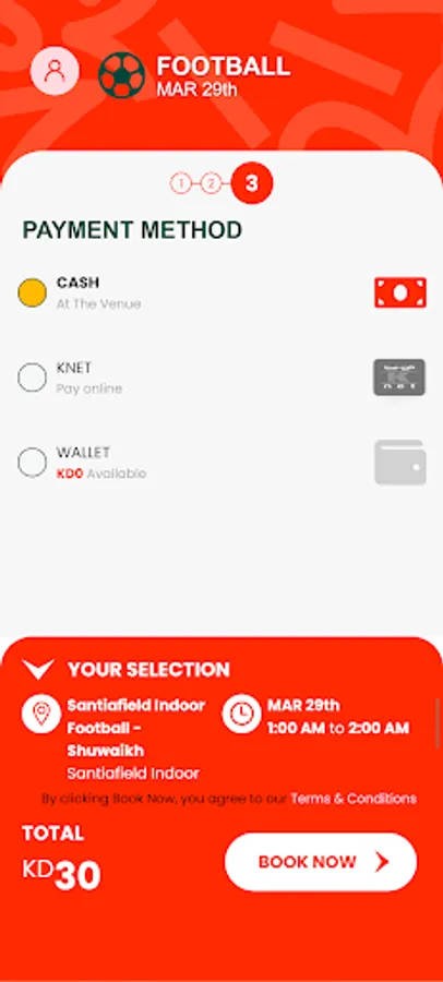 * Book your favorite sport and choose whether you want to pay cash or online.