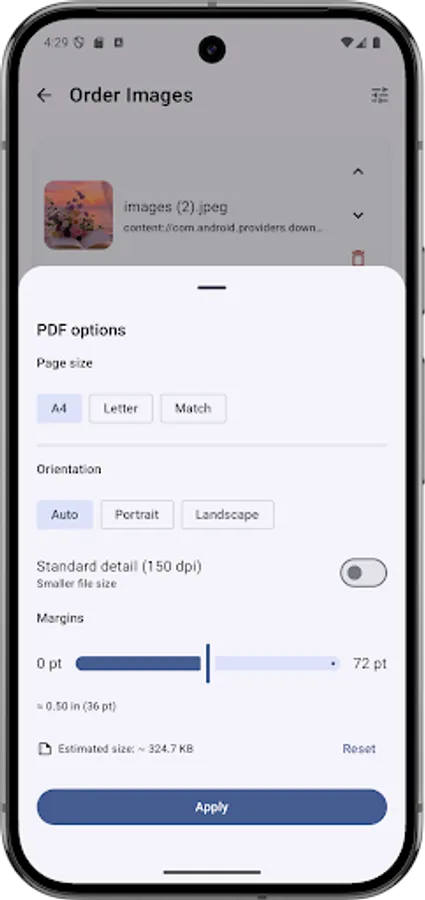 ⚬ Images → PDF, your way: set page size (A4, Letter, or Match image), orientation (Auto/Portrait/Landscape), margins, and detail (150/300 dpi).