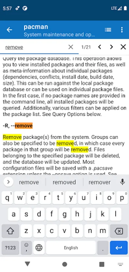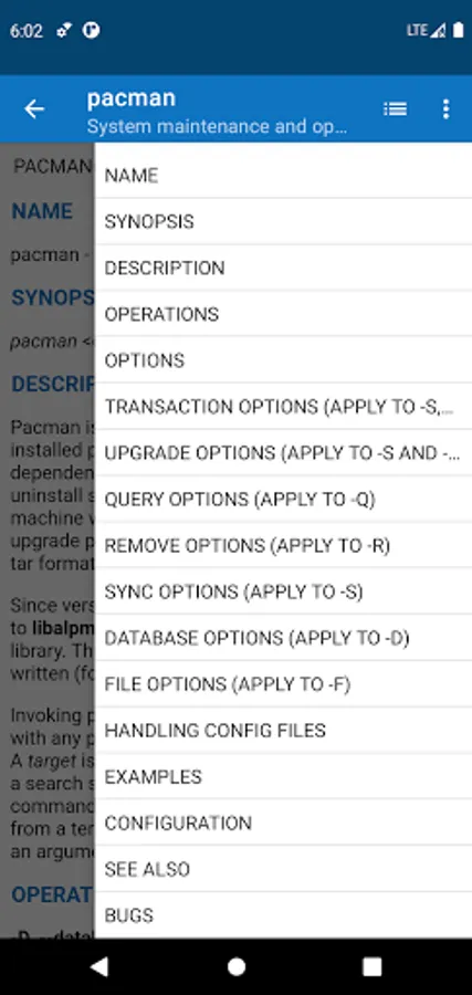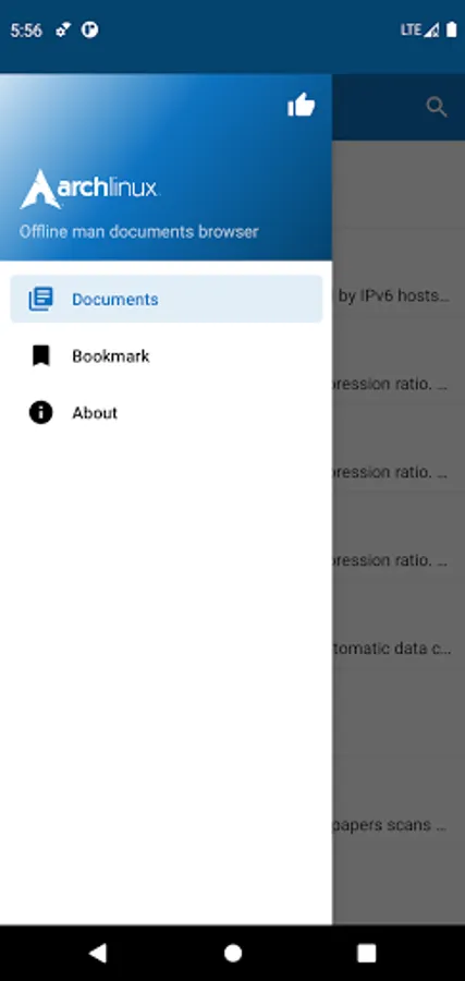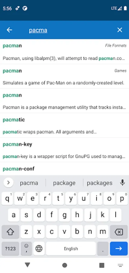 Arch Doc is exactly your choice. It packs almost all(10k +) documents which from the official arch linux repository (https://archlinux.org/packages/). When searching or reading the doc it does not require any android permissions, supports full-text search, no ads, find in page, click on related documents to jump, bookmark. Those convenient functions allows you to read man doc more efficiently, quickly and intently.