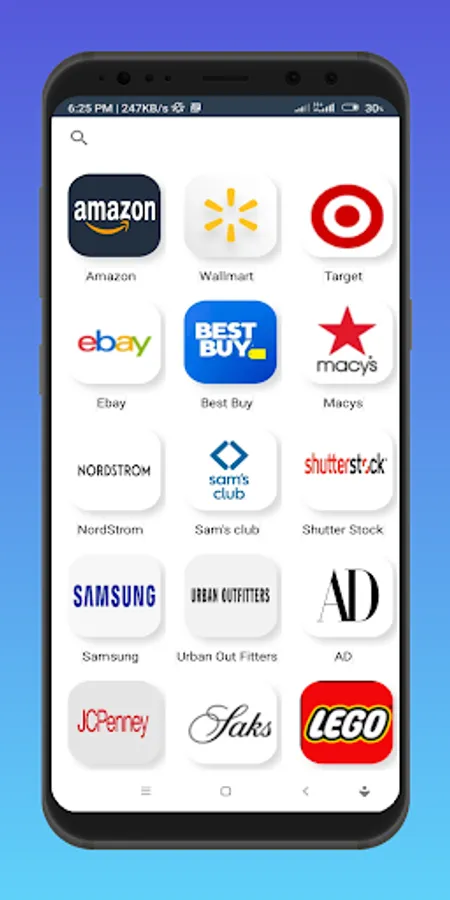 It's has all kind of Online Shopping stores like amazon, walmart, target, ebay, bestbuy, macys, nordstrom, samsclub, shutterstock, samsung, urbanoutfitters, architecturaldigest,