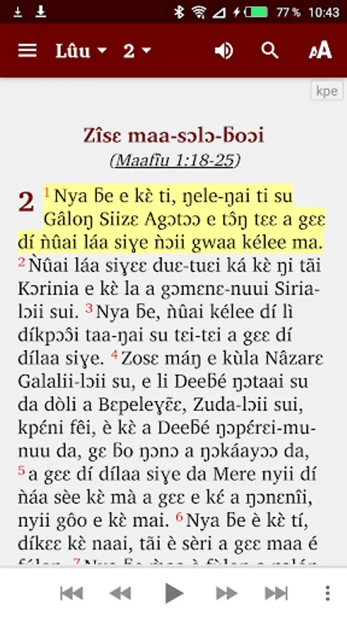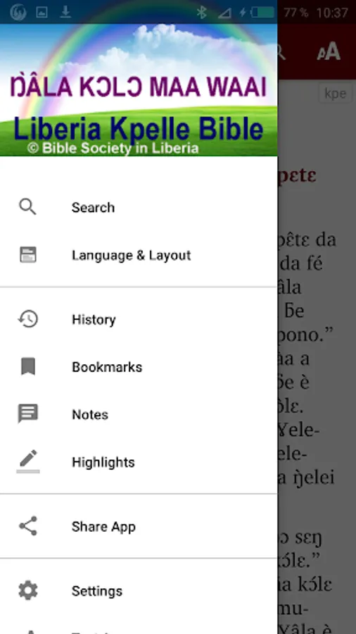 The Word of God translated into the Kpelle language of Liberia. For the New Testament you can download audio files so that you can read and listen to the text at the same time. May god bless His precious Word.