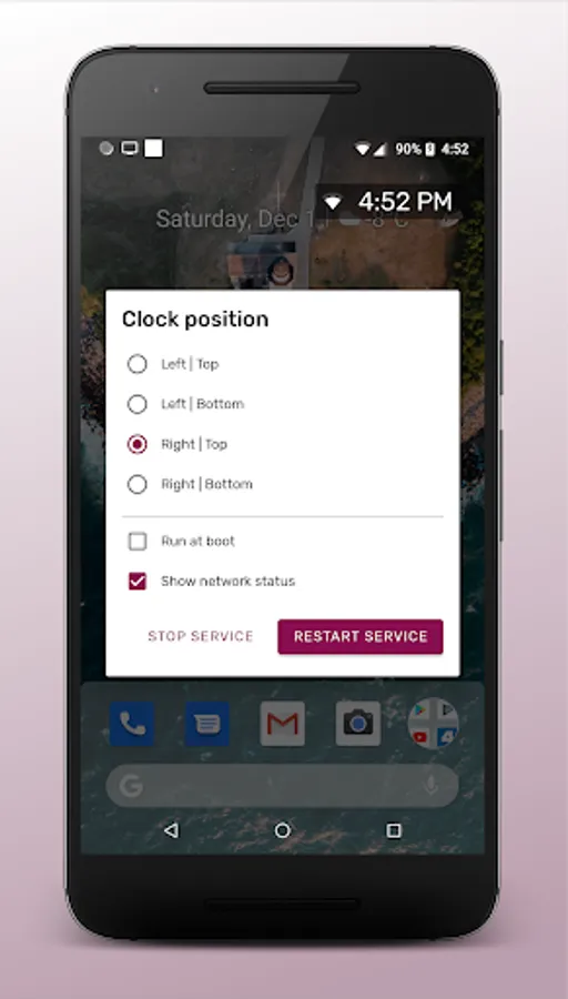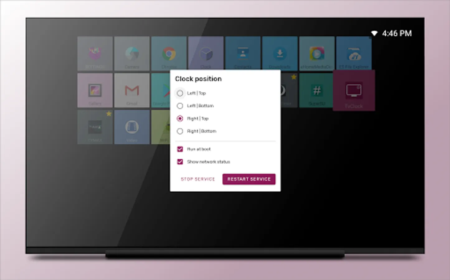 TvClock displays the time and status of connection to the network in one of the 4 corners of the screen.