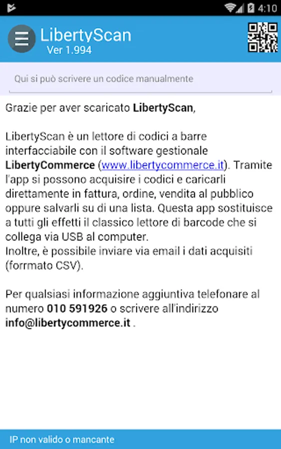 Libertyscan is an app that has the purpose of replacing the classic reader of bar codes in situations where there is the need for a high speed in the acquisition of the code, the latter is acquired via the device's camera.