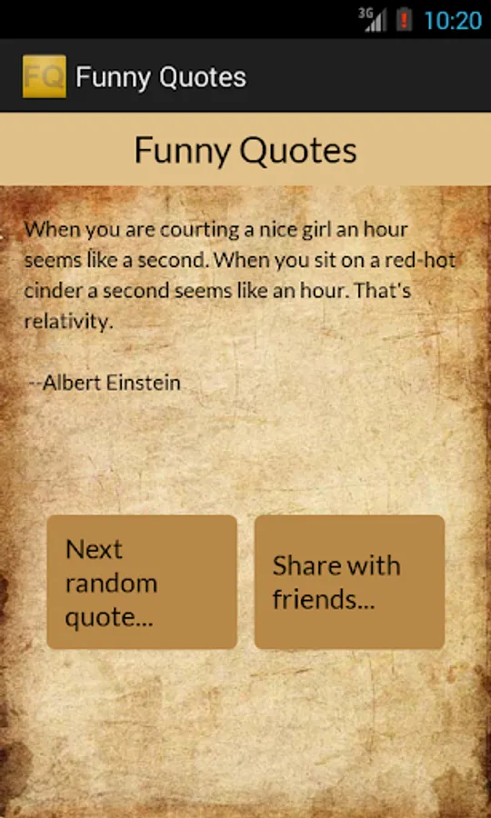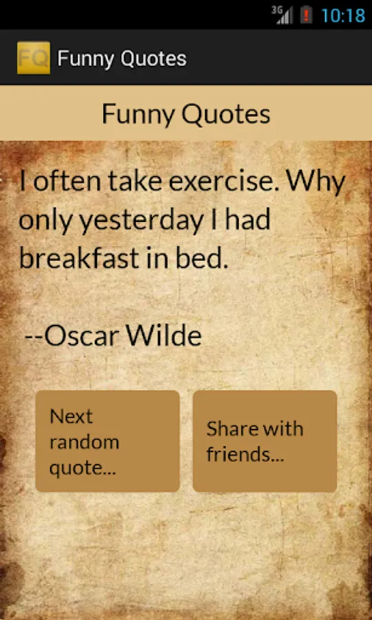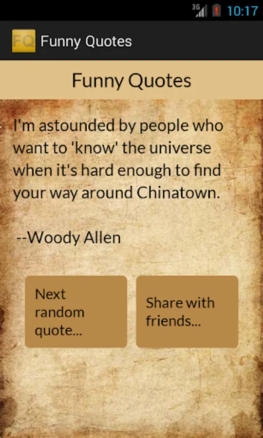 The huge database of funny famous quotes. The authors of these quotes are Woody Allen, Groucho Marx, Mark Twain, Winston Churchill, Oscar Wilde and many others. But this is not ordinary quotes of those people, This is really unusual and funny quotes. If you repeat these quotes in the community, you will look eloquent and erudite. Just download the app, and all the best sayings of famous people are in your device.
