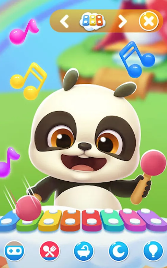 Interact with the panda by touching him in different ways and making him fly, box, and play drums.
