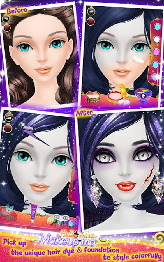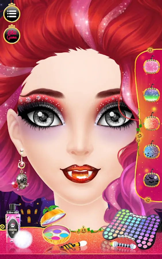 Choose a beautiful skin tone for your girl to start off, then use the tinted BB cream on her face and neck. If you are tired of having a dull hair color, we'd like to give you our bran-new hair highlighting, which will absolutely lighten the young lady with bright and vivid colors. By clicking the hair dye, you can also add some bold, warm highlights, even 2 or 3 colors can be used at the same time. For example, try to mix pale pink with a brighter fuchsia or copper reds in dark brunette hair, you can have so much fun here. And you will definitely be amazed by the Halloween-themed cosmetics, these eye shadows, mascaras and lipsticks will help your little girl to achieve a magical look. Of course, surprise will never end, drawing tattoos and adding accessories like rhinestones and earrings are also essential for your monster girl to make difference. Now it's time to check out which awesome spooky girl will win her designer the first prize!