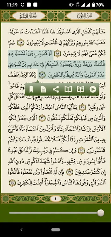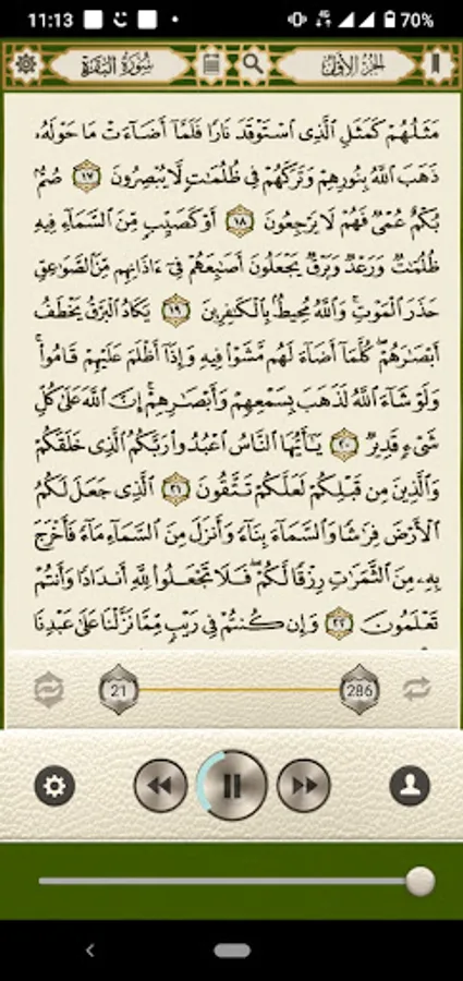 The beautiful recitation player within the application allows you to choose the verses you want to hear and choose the number of times to repeat the verses and the repetition of each verse. You can choose from 41 recitations for different reciters.
