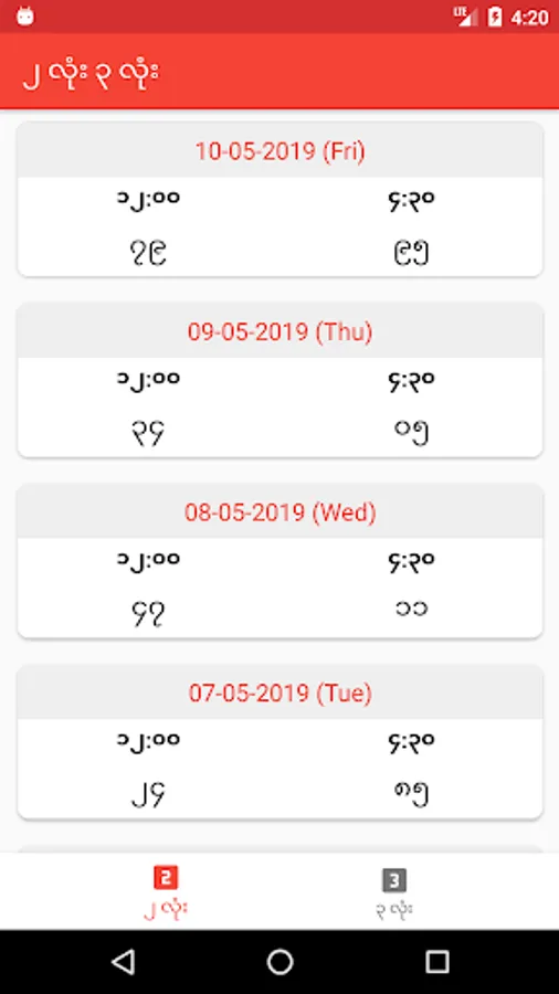 ၂ လုံး ၃ လုံး နံပါတ်များကို ကြည့်နိုင်ရန်။ ရက်အလိုက်ကြည့်နိုင်သည်။ လောင်းကစား App မဟုတ်ပါ။