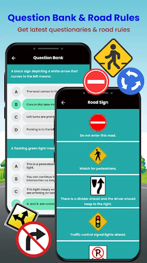 - Driving test gives the road signs detailed information.