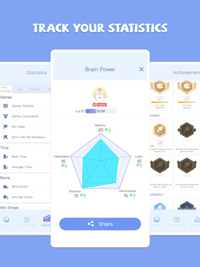✓ Brain Power. Multi-dimensional statistics and analysis of your brain performance while solving puzzles.