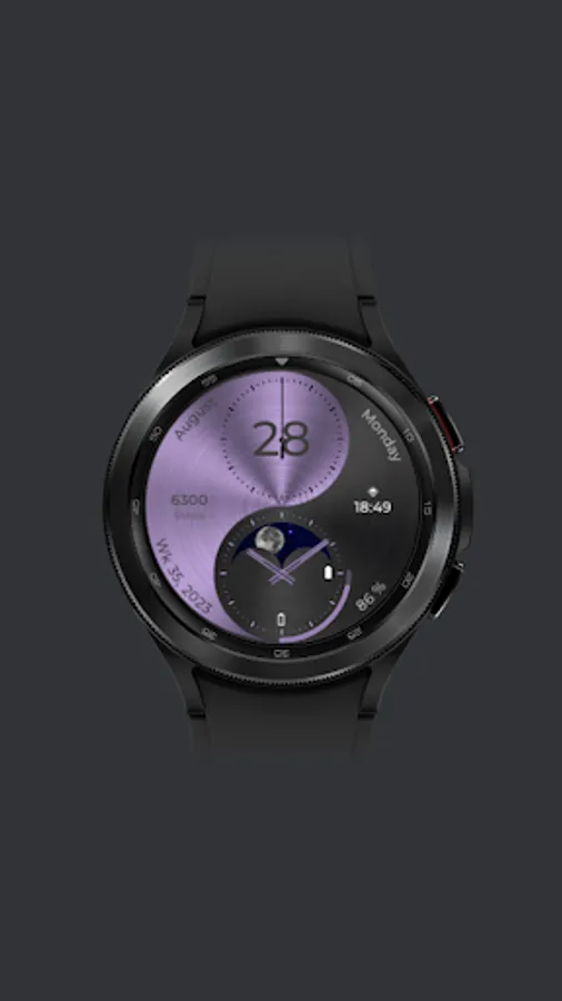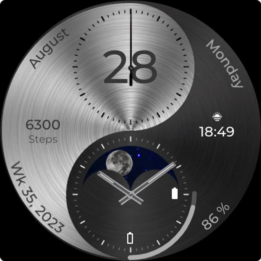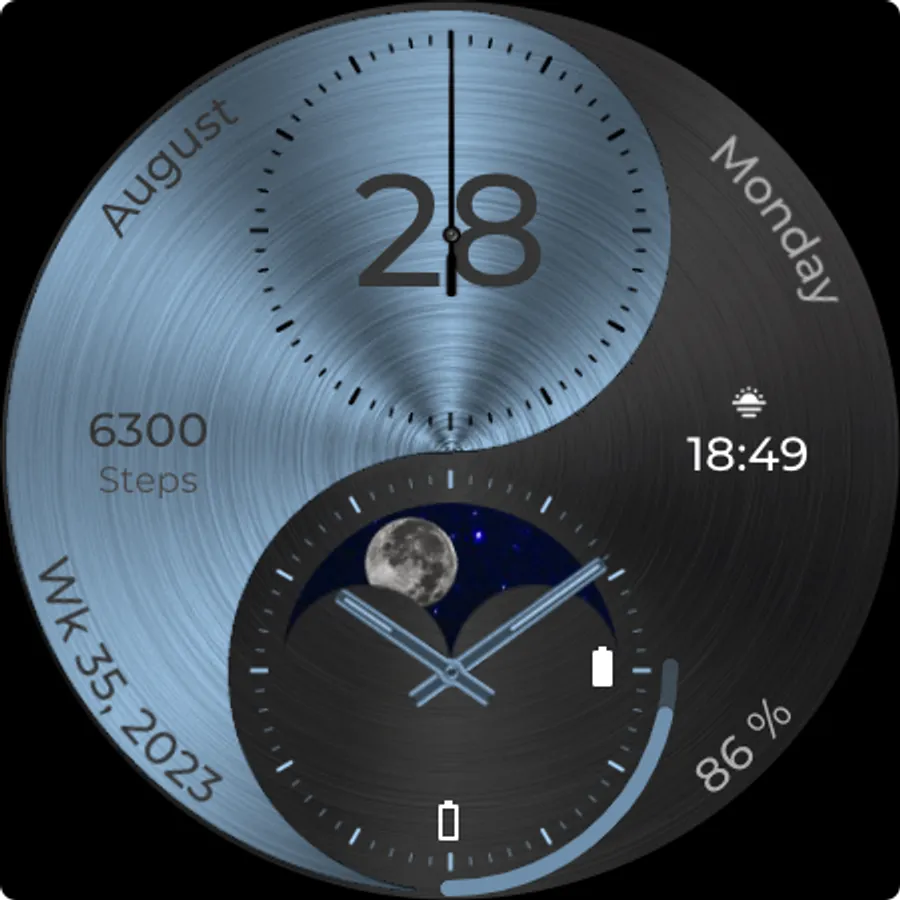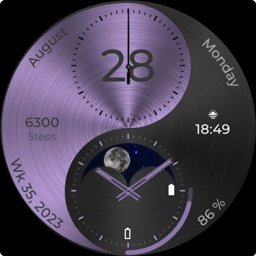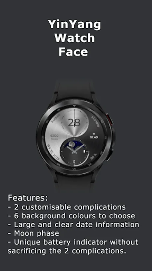 Fusion design Yin Yang watch face allowing user to choose from 6 different colour background.