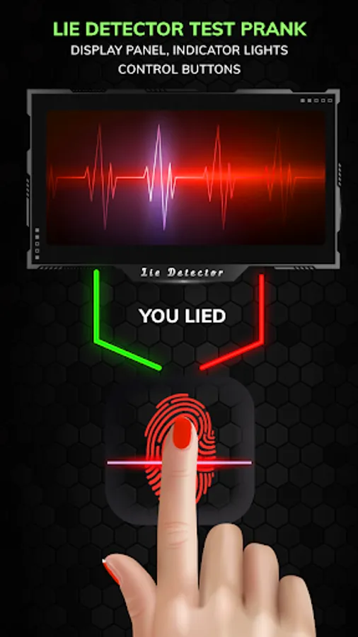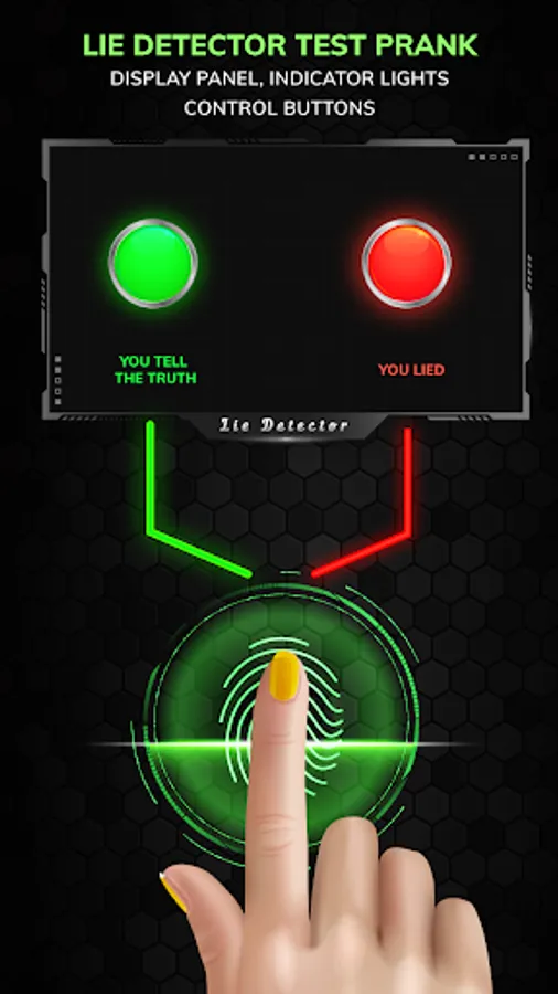 Lie Detector - Lie Detector Test Prank is a funny game which simulates to detect whether you are telling the truth or lying. With Lie Detector You can preset the result to prank your friends! Press the volume key when scanning. (volume+ for truth, volume- for lie).