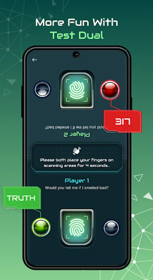 Refresh the way to play lie detector with 2 player simultaneous check feature. Ask a question, let them both answer and place their hands on the screen. Find out who is lying fast.