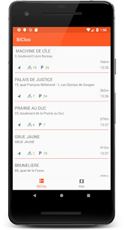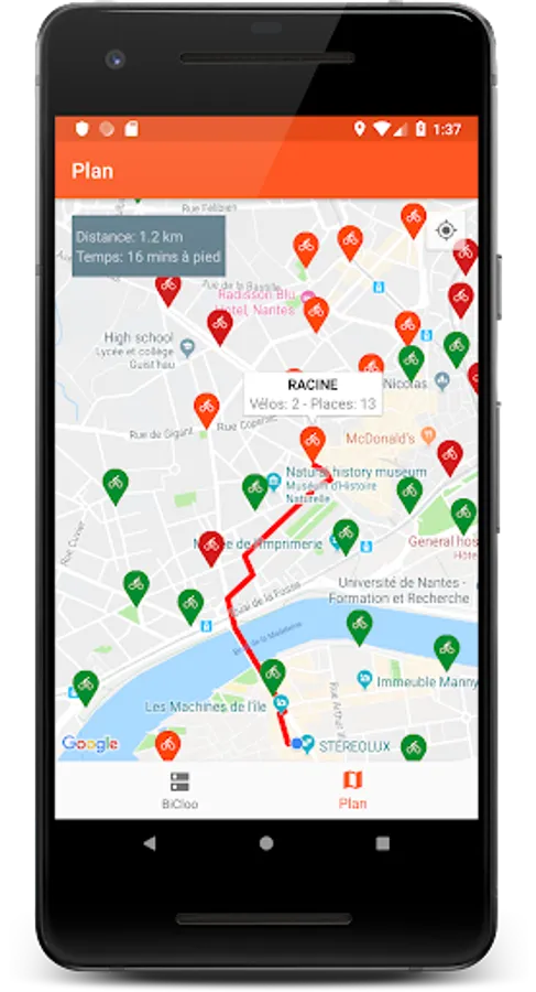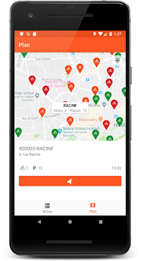 * view the location and the number of Bicloo available in real time, in the form of map and list