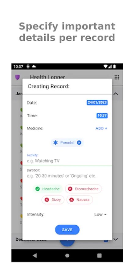 If you are suffering from migraines and you would like to monitor your health's status, then this app is for you. You can log the date/time of the migraine hit, which medicine you took (if you took any), what you were doing and how long did it last. You can share these info as PDF file with your doctor, so you could get an feedback on your health status.