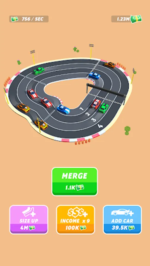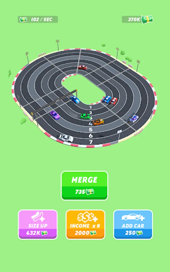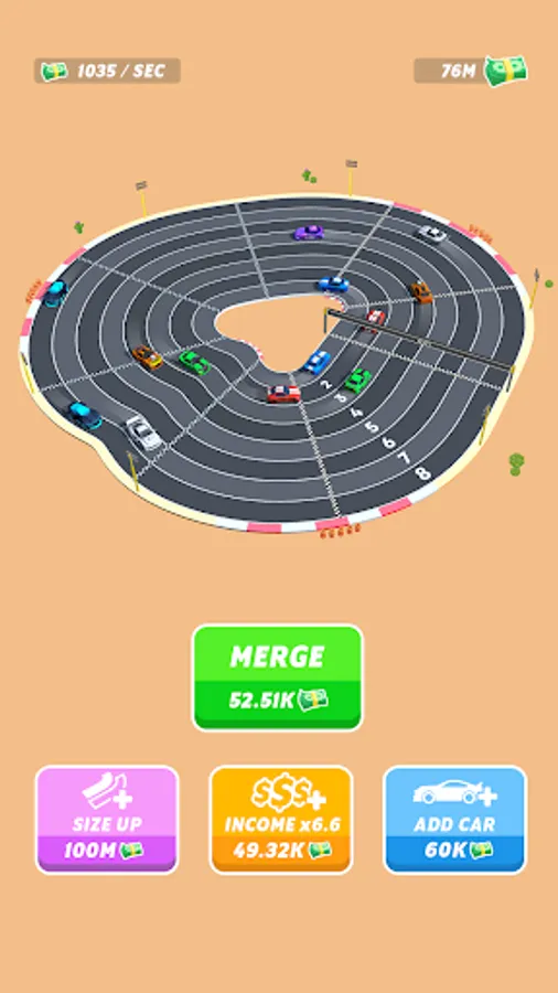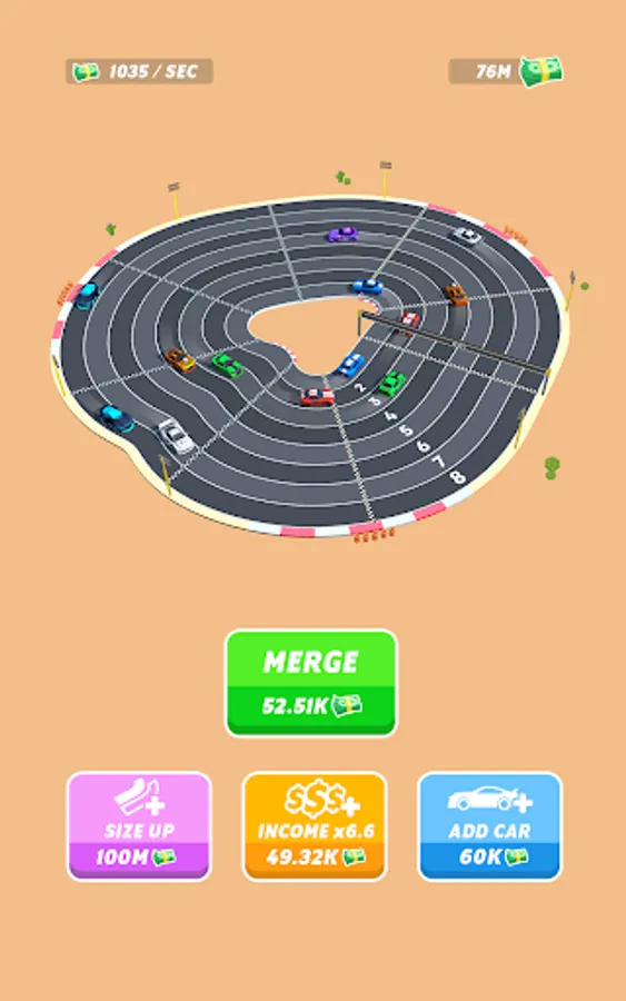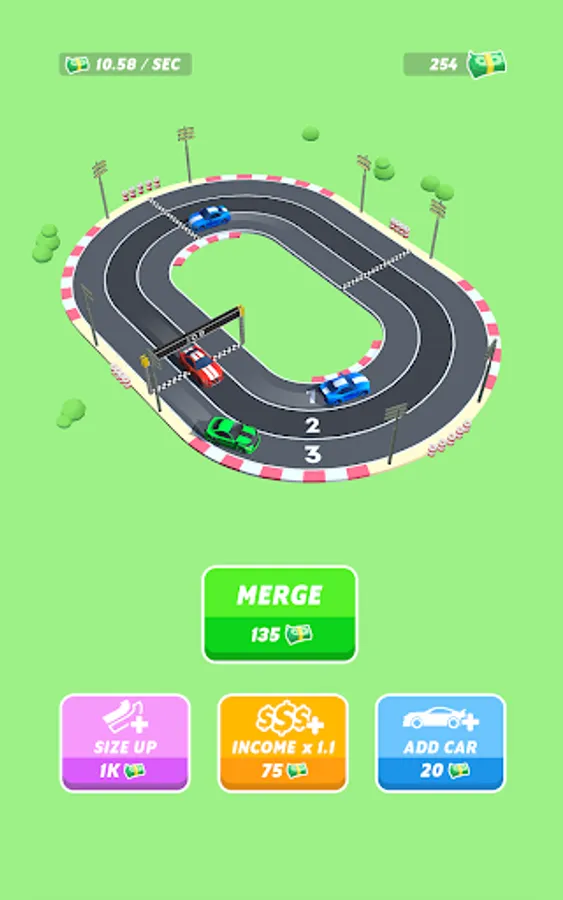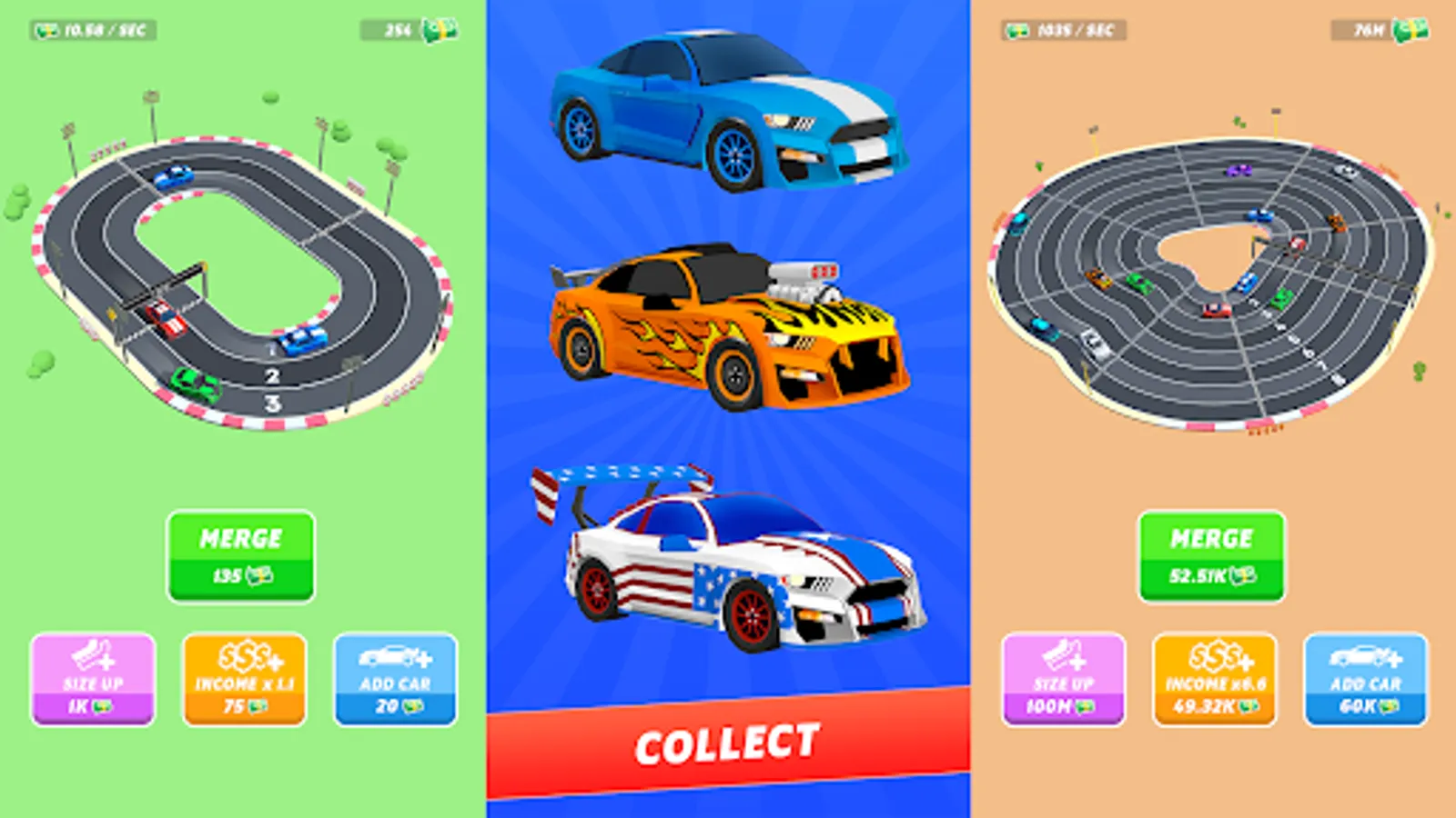 Tap to race! Merge cars to unlock faster cars. Earn idle money and expand your race track. Build your Racing Empire.