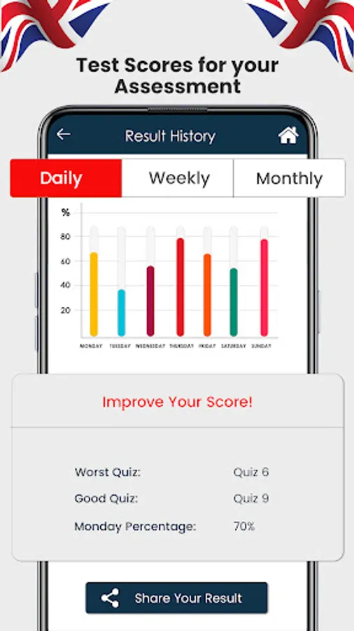 ★ UK Test Preparation Result History: Life in the UK ebook and test app on daily, weekly, and monthly basis find result history of your attempted life in UK quizzes.