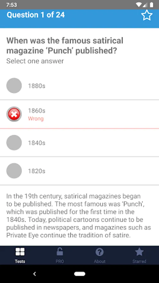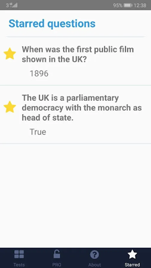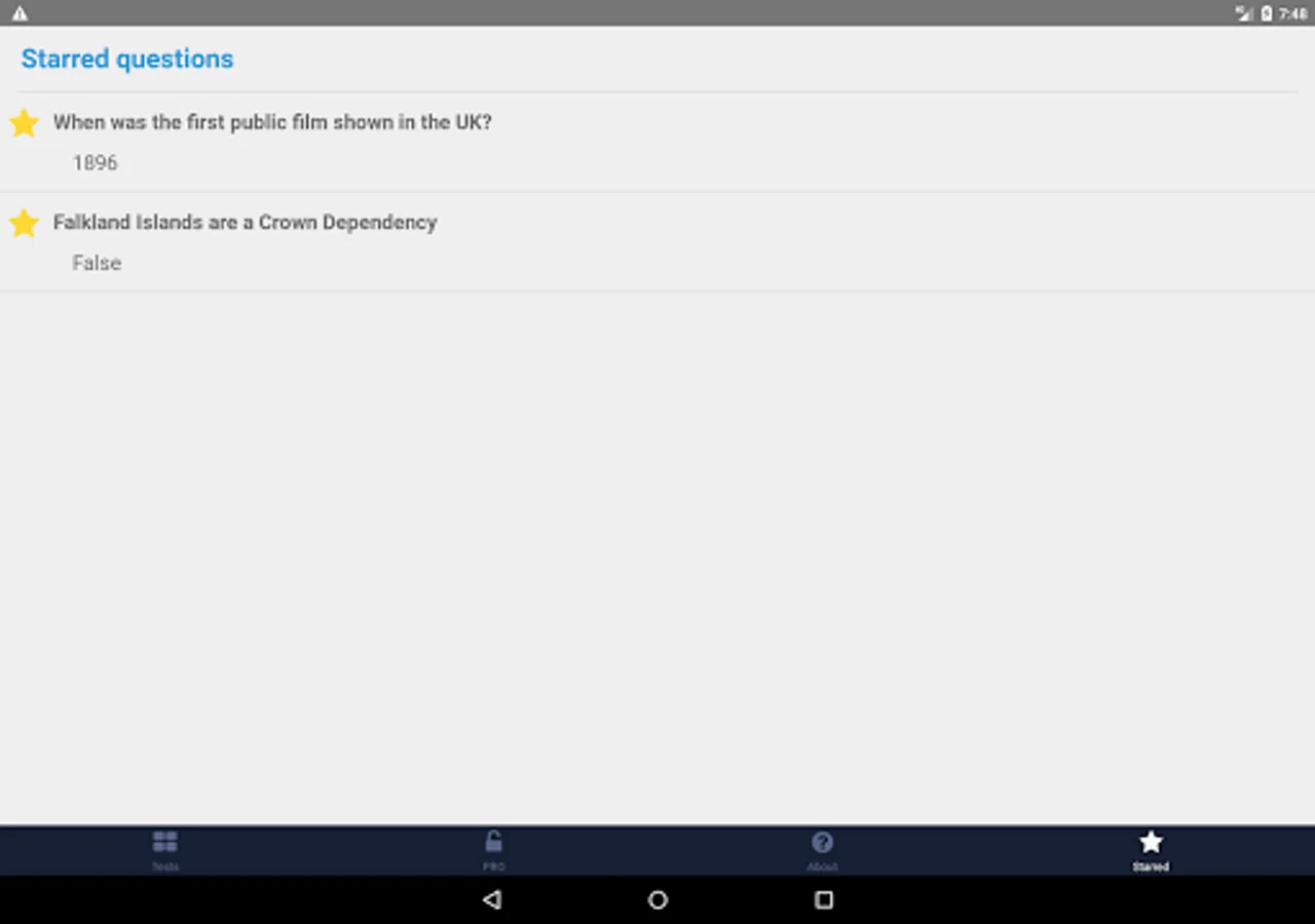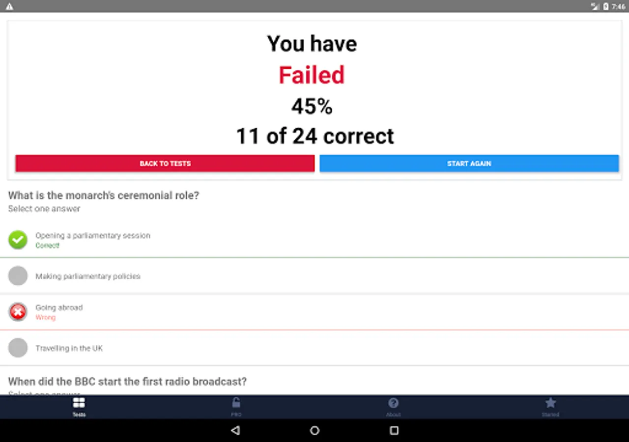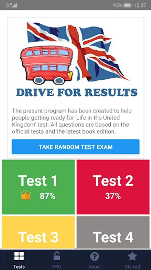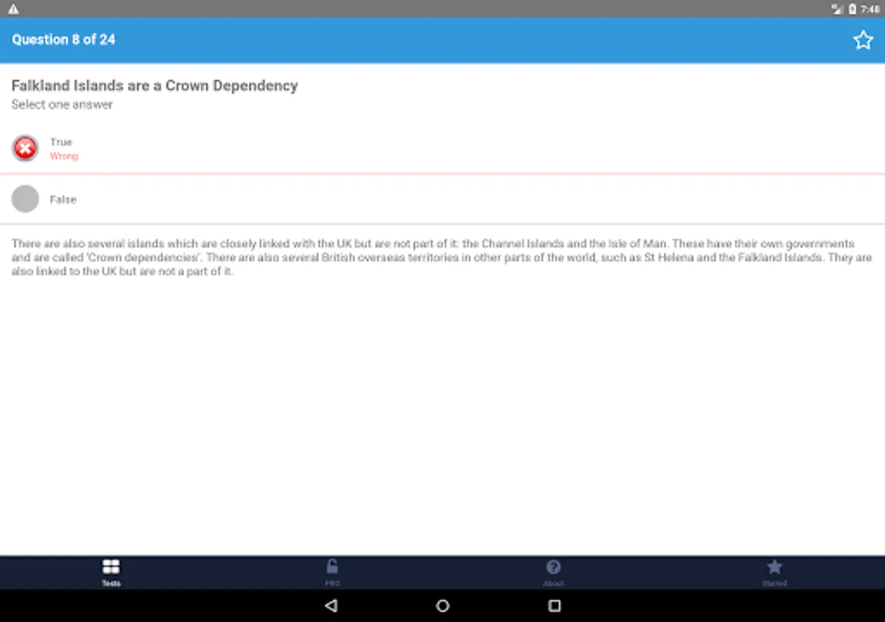 All questions were carefully selected from the official handbook for the Life in the UK Test – 3rd Edition. There is more than 1000 of them! Good news is that questions and answers are shown randomly every time you open the test. That means that you won’t be able to memorize the position of the correct answer or question order.