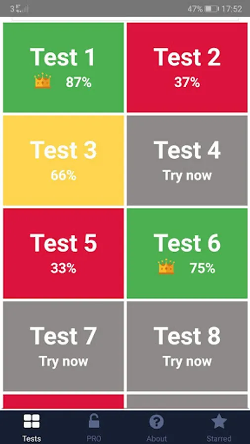 The present app includes 48 grey colour squares-tests, which change the colour according to your progress. Grey colour means that you have not started this test yet. Depending on your progress, squares become yellow, red or green colour. The goal is to make all squares green and collect 48 crowns. After it is done, you are ready to pass the exam!
